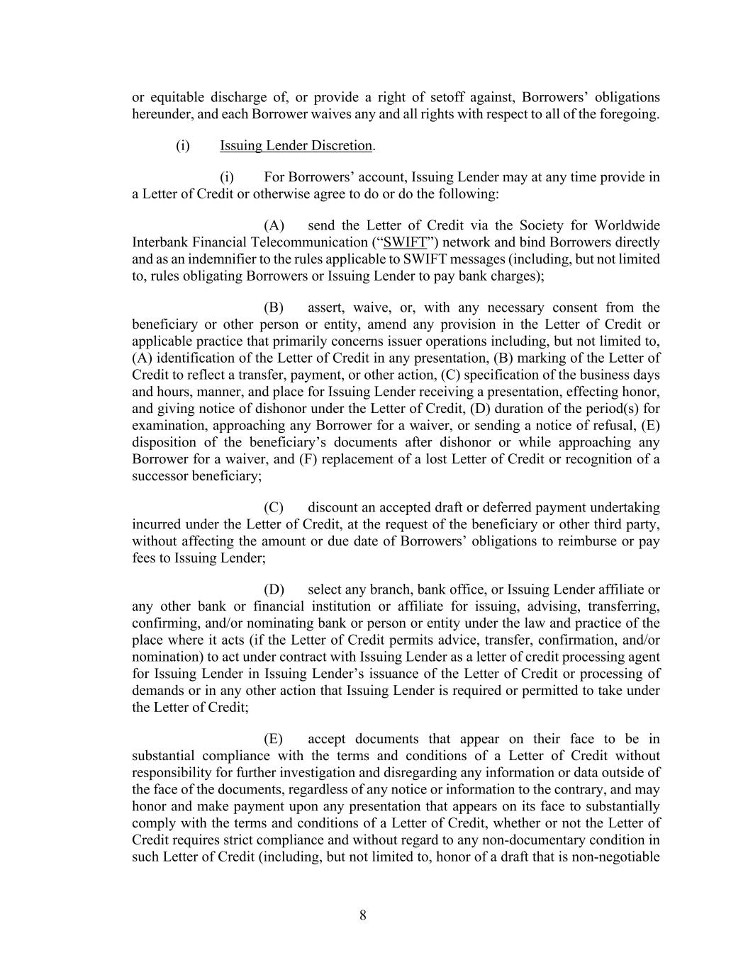 8 or equitable discharge of, or provide a right of setoff against, Borrowers’ obligations hereunder, and each Borrower waives any and all rights with respect to all of the foregoing. (i) Issuing Lender Discretion. (i) For Borrowers’ account, Issuing Lender may at any time provide in a Letter of Credit or otherwise agree to do or do the following: (A) send the Letter of Credit via the Society for Worldwide Interbank Financial Telecommunication (“SWIFT”) network and bind Borrowers directly and as an indemnifier to the rules applicable to SWIFT messages (including, but not limited to, rules obligating Borrowers or Issuing Lender to pay bank charges); (B) assert, waive, or, with any necessary consent from the beneficiary or other person or entity, amend any provision in the Letter of Credit or applicable practice that primarily concerns issuer operations including, but not limited to, (A) identification of the Letter of Credit in any presentation, (B) marking of the Letter of Credit to reflect a transfer, payment, or other action, (C) specification of the business days and hours, manner, and place for Issuing Lender receiving a presentation, effecting honor, and giving notice of dishonor under the Letter of Credit, (D) duration of the period(s) for examination, approaching any Borrower for a waiver, or sending a notice of refusal, (E) disposition of the beneficiary’s documents after dishonor or while approaching any Borrower for a waiver, and (F) replacement of a lost Letter of Credit or recognition of a successor beneficiary; (C) discount an accepted draft or deferred payment undertaking incurred under the Letter of Credit, at the request of the beneficiary or other third party, without affecting the amount or due date of Borrowers’ obligations to reimburse or pay fees to Issuing Lender; (D) select any branch, bank office, or Issuing Lender affiliate or any other bank or financial institution or affiliate for issuing, advising, transferring, confirming, and/or nominating bank or person or entity under the law and practice of the place where it acts (if the Letter of Credit permits advice, transfer, confirmation, and/or nomination) to act under contract with Issuing Lender as a letter of credit processing agent for Issuing Lender in Issuing Lender’s issuance of the Letter of Credit or processing of demands or in any other action that Issuing Lender is required or permitted to take under the Letter of Credit; (E) accept documents that appear on their face to be in substantial compliance with the terms and conditions of a Letter of Credit without responsibility for further investigation and disregarding any information or data outside of the face of the documents, regardless of any notice or information to the contrary, and may honor and make payment upon any presentation that appears on its face to substantially comply with the terms and conditions of a Letter of Credit, whether or not the Letter of Credit requires strict compliance and without regard to any non-documentary condition in such Letter of Credit (including, but not limited to, honor of a draft that is non-negotiable