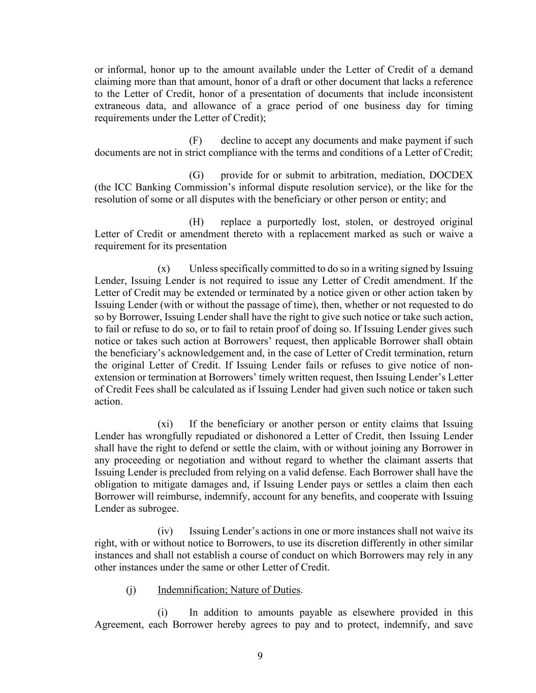 9 or informal, honor up to the amount available under the Letter of Credit of a demand claiming more than that amount, honor of a draft or other document that lacks a reference to the Letter of Credit, honor of a presentation of documents that include inconsistent extraneous data, and allowance of a grace period of one business day for timing requirements under the Letter of Credit); (F) decline to accept any documents and make payment if such documents are not in strict compliance with the terms and conditions of a Letter of Credit; (G) provide for or submit to arbitration, mediation, DOCDEX (the ICC Banking Commission’s informal dispute resolution service), or the like for the resolution of some or all disputes with the beneficiary or other person or entity; and (H) replace a purportedly lost, stolen, or destroyed original Letter of Credit or amendment thereto with a replacement marked as such or waive a requirement for its presentation (x) Unless specifically committed to do so in a writing signed by Issuing Lender, Issuing Lender is not required to issue any Letter of Credit amendment. If the Letter of Credit may be extended or terminated by a notice given or other action taken by Issuing Lender (with or without the passage of time), then, whether or not requested to do so by Borrower, Issuing Lender shall have the right to give such notice or take such action, to fail or refuse to do so, or to fail to retain proof of doing so. If Issuing Lender gives such notice or takes such action at Borrowers’ request, then applicable Borrower shall obtain the beneficiary’s acknowledgement and, in the case of Letter of Credit termination, return the original Letter of Credit. If Issuing Lender fails or refuses to give notice of non- extension or termination at Borrowers’ timely written request, then Issuing Lender’s Letter of Credit Fees shall be calculated as if Issuing Lender had given such notice or taken such action. (xi) If the beneficiary or another person or entity claims that Issuing Lender has wrongfully repudiated or dishonored a Letter of Credit, then Issuing Lender shall have the right to defend or settle the claim, with or without joining any Borrower in any proceeding or negotiation and without regard to whether the claimant asserts that Issuing Lender is precluded from relying on a valid defense. Each Borrower shall have the obligation to mitigate damages and, if Issuing Lender pays or settles a claim then each Borrower will reimburse, indemnify, account for any benefits, and cooperate with Issuing Lender as subrogee. (iv) Issuing Lender’s actions in one or more instances shall not waive its right, with or without notice to Borrowers, to use its discretion differently in other similar instances and shall not establish a course of conduct on which Borrowers may rely in any other instances under the same or other Letter of Credit. (j) Indemnification; Nature of Duties. (i) In addition to amounts payable as elsewhere provided in this Agreement, each Borrower hereby agrees to pay and to protect, indemnify, and save