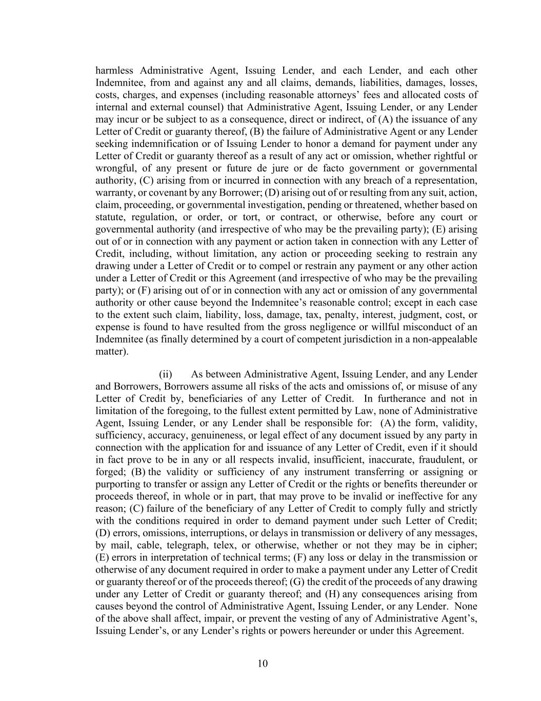 10 harmless Administrative Agent, Issuing Lender, and each Lender, and each other Indemnitee, from and against any and all claims, demands, liabilities, damages, losses, costs, charges, and expenses (including reasonable attorneys’ fees and allocated costs of internal and external counsel) that Administrative Agent, Issuing Lender, or any Lender may incur or be subject to as a consequence, direct or indirect, of (A) the issuance of any Letter of Credit or guaranty thereof, (B) the failure of Administrative Agent or any Lender seeking indemnification or of Issuing Lender to honor a demand for payment under any Letter of Credit or guaranty thereof as a result of any act or omission, whether rightful or wrongful, of any present or future de jure or de facto government or governmental authority, (C) arising from or incurred in connection with any breach of a representation, warranty, or covenant by any Borrower; (D) arising out of or resulting from any suit, action, claim, proceeding, or governmental investigation, pending or threatened, whether based on statute, regulation, or order, or tort, or contract, or otherwise, before any court or governmental authority (and irrespective of who may be the prevailing party); (E) arising out of or in connection with any payment or action taken in connection with any Letter of Credit, including, without limitation, any action or proceeding seeking to restrain any drawing under a Letter of Credit or to compel or restrain any payment or any other action under a Letter of Credit or this Agreement (and irrespective of who may be the prevailing party); or (F) arising out of or in connection with any act or omission of any governmental authority or other cause beyond the Indemnitee’s reasonable control; except in each case to the extent such claim, liability, loss, damage, tax, penalty, interest, judgment, cost, or expense is found to have resulted from the gross negligence or willful misconduct of an Indemnitee (as finally determined by a court of competent jurisdiction in a non-appealable matter). (ii) As between Administrative Agent, Issuing Lender, and any Lender and Borrowers, Borrowers assume all risks of the acts and omissions of, or misuse of any Letter of Credit by, beneficiaries of any Letter of Credit. In furtherance and not in limitation of the foregoing, to the fullest extent permitted by Law, none of Administrative Agent, Issuing Lender, or any Lender shall be responsible for: (A) the form, validity, sufficiency, accuracy, genuineness, or legal effect of any document issued by any party in connection with the application for and issuance of any Letter of Credit, even if it should in fact prove to be in any or all respects invalid, insufficient, inaccurate, fraudulent, or forged; (B) the validity or sufficiency of any instrument transferring or assigning or purporting to transfer or assign any Letter of Credit or the rights or benefits thereunder or proceeds thereof, in whole or in part, that may prove to be invalid or ineffective for any reason; (C) failure of the beneficiary of any Letter of Credit to comply fully and strictly with the conditions required in order to demand payment under such Letter of Credit; (D) errors, omissions, interruptions, or delays in transmission or delivery of any messages, by mail, cable, telegraph, telex, or otherwise, whether or not they may be in cipher; (E) errors in interpretation of technical terms; (F) any loss or delay in the transmission or otherwise of any document required in order to make a payment under any Letter of Credit or guaranty thereof or of the proceeds thereof; (G) the credit of the proceeds of any drawing under any Letter of Credit or guaranty thereof; and (H) any consequences arising from causes beyond the control of Administrative Agent, Issuing Lender, or any Lender. None of the above shall affect, impair, or prevent the vesting of any of Administrative Agent’s, Issuing Lender’s, or any Lender’s rights or powers hereunder or under this Agreement.