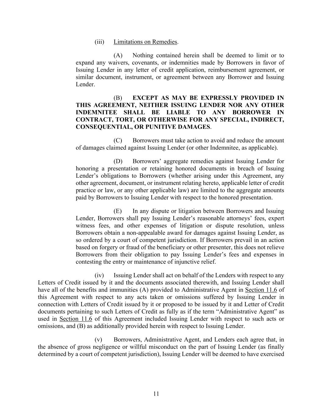 11 (iii) Limitations on Remedies. (A) Nothing contained herein shall be deemed to limit or to expand any waivers, covenants, or indemnities made by Borrowers in favor of Issuing Lender in any letter of credit application, reimbursement agreement, or similar document, instrument, or agreement between any Borrower and Issuing Lender. (B) EXCEPT AS MAY BE EXPRESSLY PROVIDED IN THIS AGREEMENT, NEITHER ISSUING LENDER NOR ANY OTHER INDEMNITEE SHALL BE LIABLE TO ANY BORROWER IN CONTRACT, TORT, OR OTHERWISE FOR ANY SPECIAL, INDIRECT, CONSEQUENTIAL, OR PUNITIVE DAMAGES. (C) Borrowers must take action to avoid and reduce the amount of damages claimed against Issuing Lender (or other Indemnitee, as applicable). (D) Borrowers’ aggregate remedies against Issuing Lender for honoring a presentation or retaining honored documents in breach of Issuing Lender’s obligations to Borrowers (whether arising under this Agreement, any other agreement, document, or instrument relating hereto, applicable letter of credit practice or law, or any other applicable law) are limited to the aggregate amounts paid by Borrowers to Issuing Lender with respect to the honored presentation. (E) In any dispute or litigation between Borrowers and Issuing Lender, Borrowers shall pay Issuing Lender’s reasonable attorneys’ fees, expert witness fees, and other expenses of litigation or dispute resolution, unless Borrowers obtain a non-appealable award for damages against Issuing Lender, as so ordered by a court of competent jurisdiction. If Borrowers prevail in an action based on forgery or fraud of the beneficiary or other presenter, this does not relieve Borrowers from their obligation to pay Issuing Lender’s fees and expenses in contesting the entry or maintenance of injunctive relief. (iv) Issuing Lender shall act on behalf of the Lenders with respect to any Letters of Credit issued by it and the documents associated therewith, and Issuing Lender shall have all of the benefits and immunities (A) provided to Administrative Agent in Section 11.6 of this Agreement with respect to any acts taken or omissions suffered by Issuing Lender in connection with Letters of Credit issued by it or proposed to be issued by it and Letter of Credit documents pertaining to such Letters of Credit as fully as if the term “Administrative Agent” as used in Section 11.6 of this Agreement included Issuing Lender with respect to such acts or omissions, and (B) as additionally provided herein with respect to Issuing Lender. (v) Borrowers, Administrative Agent, and Lenders each agree that, in the absence of gross negligence or willful misconduct on the part of Issuing Lender (as finally determined by a court of competent jurisdiction), Issuing Lender will be deemed to have exercised