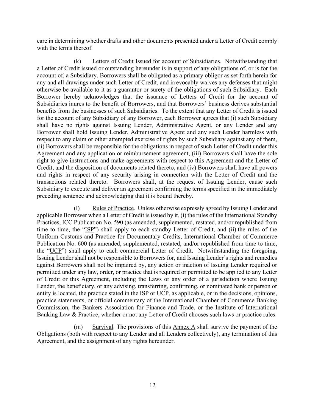12 care in determining whether drafts and other documents presented under a Letter of Credit comply with the terms thereof. (k) Letters of Credit Issued for account of Subsidiaries. Notwithstanding that a Letter of Credit issued or outstanding hereunder is in support of any obligations of, or is for the account of, a Subsidiary, Borrowers shall be obligated as a primary obligor as set forth herein for any and all drawings under such Letter of Credit, and irrevocably waives any defenses that might otherwise be available to it as a guarantor or surety of the obligations of such Subsidiary. Each Borrower hereby acknowledges that the issuance of Letters of Credit for the account of Subsidiaries inures to the benefit of Borrowers, and that Borrowers’ business derives substantial benefits from the businesses of such Subsidiaries. To the extent that any Letter of Credit is issued for the account of any Subsidiary of any Borrower, each Borrower agrees that (i) such Subsidiary shall have no rights against Issuing Lender, Administrative Agent, or any Lender and any Borrower shall hold Issuing Lender, Administrative Agent and any such Lender harmless with respect to any claim or other attempted exercise of rights by such Subsidiary against any of them, (ii) Borrowers shall be responsible for the obligations in respect of such Letter of Credit under this Agreement and any application or reimbursement agreement, (iii) Borrowers shall have the sole right to give instructions and make agreements with respect to this Agreement and the Letter of Credit, and the disposition of documents related thereto, and (iv) Borrowers shall have all powers and rights in respect of any security arising in connection with the Letter of Credit and the transactions related thereto. Borrowers shall, at the request of Issuing Lender, cause such Subsidiary to execute and deliver an agreement confirming the terms specified in the immediately preceding sentence and acknowledging that it is bound thereby. (l) Rules of Practice. Unless otherwise expressly agreed by Issuing Lender and applicable Borrower when a Letter of Credit is issued by it, (i) the rules of the International Standby Practices, ICC Publication No. 590 (as amended, supplemented, restated, and/or republished from time to time, the “ISP”) shall apply to each standby Letter of Credit, and (ii) the rules of the Uniform Customs and Practice for Documentary Credits, International Chamber of Commerce Publication No. 600 (as amended, supplemented, restated, and/or republished from time to time, the “UCP”) shall apply to each commercial Letter of Credit. Notwithstanding the foregoing, Issuing Lender shall not be responsible to Borrowers for, and Issuing Lender’s rights and remedies against Borrowers shall not be impaired by, any action or inaction of Issuing Lender required or permitted under any law, order, or practice that is required or permitted to be applied to any Letter of Credit or this Agreement, including the Laws or any order of a jurisdiction where Issuing Lender, the beneficiary, or any advising, transferring, confirming, or nominated bank or person or entity is located, the practice stated in the ISP or UCP, as applicable, or in the decisions, opinions, practice statements, or official commentary of the International Chamber of Commerce Banking Commission, the Bankers Association for Finance and Trade, or the Institute of International Banking Law & Practice, whether or not any Letter of Credit chooses such laws or practice rules. (m) Survival. The provisions of this Annex A shall survive the payment of the Obligations (both with respect to any Lender and all Lenders collectively), any termination of this Agreement, and the assignment of any rights hereunder.