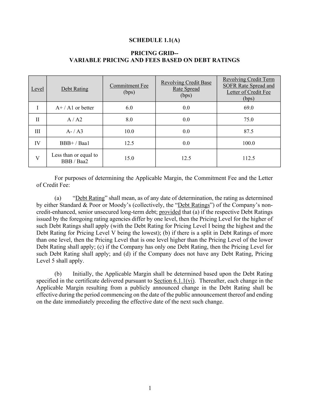 1 SCHEDULE 1.1(A) PRICING GRID-- VARIABLE PRICING AND FEES BASED ON DEBT RATINGS Level Debt Rating Commitment Fee (bps) Revolving Credit Base Rate Spread (bps) Revolving Credit Term SOFR Rate Spread and Letter of Credit Fee (bps) I A+ / A1 or better 6.0 0.0 69.0 II A / A2 8.0 0.0 75.0 III A- / A3 10.0 0.0 87.5 IV BBB+ / Baa1 12.5 0.0 100.0 V Less than or equal to BBB / Baa2 15.0 12.5 112.5 For purposes of determining the Applicable Margin, the Commitment Fee and the Letter of Credit Fee: (a) “Debt Rating” shall mean, as of any date of determination, the rating as determined by either Standard & Poor or Moody’s (collectively, the “Debt Ratings”) of the Company’s non- credit-enhanced, senior unsecured long-term debt; provided that (a) if the respective Debt Ratings issued by the foregoing rating agencies differ by one level, then the Pricing Level for the higher of such Debt Ratings shall apply (with the Debt Rating for Pricing Level I being the highest and the Debt Rating for Pricing Level V being the lowest); (b) if there is a split in Debt Ratings of more than one level, then the Pricing Level that is one level higher than the Pricing Level of the lower Debt Rating shall apply; (c) if the Company has only one Debt Rating, then the Pricing Level for such Debt Rating shall apply; and (d) if the Company does not have any Debt Rating, Pricing Level 5 shall apply. (b) Initially, the Applicable Margin shall be determined based upon the Debt Rating specified in the certificate delivered pursuant to Section 6.1.1(vi). Thereafter, each change in the Applicable Margin resulting from a publicly announced change in the Debt Rating shall be effective during the period commencing on the date of the public announcement thereof and ending on the date immediately preceding the effective date of the next such change.