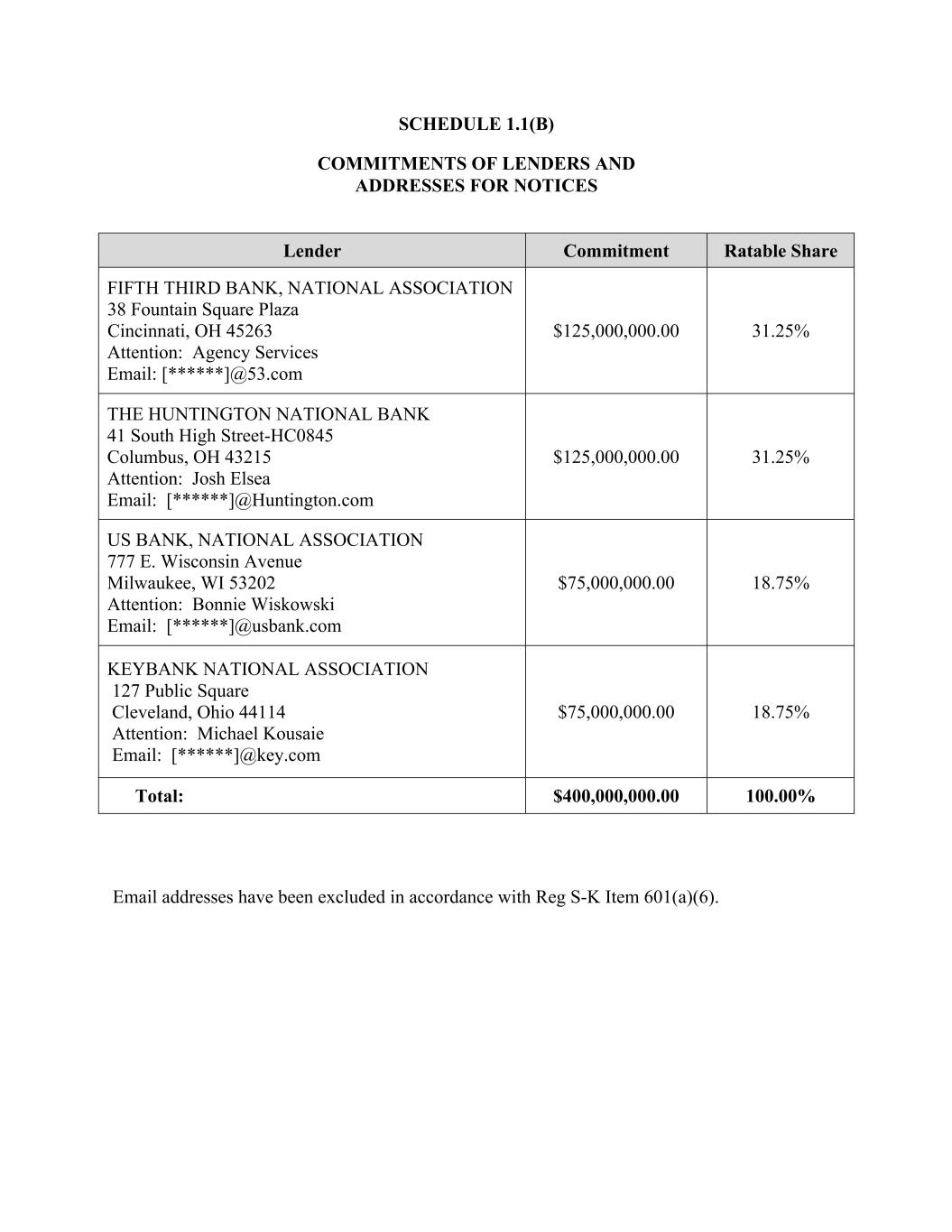 SCHEDULE 1.1(B) COMMITMENTS OF LENDERS AND ADDRESSES FOR NOTICES Lender Commitment Ratable Share FIFTH THIRD BANK, NATIONAL ASSOCIATION 38 Fountain Square Plaza Cincinnati, OH 45263 Attention: Agency Services Email: [******]@53.com $125,000,000.00 31.25% THE HUNTINGTON NATIONAL BANK 41 South High Street-HC0845 Columbus, OH 43215 Attention: Josh Elsea Email: [******]@Huntington.com $125,000,000.00 31.25% US BANK, NATIONAL ASSOCIATION 777 E. Wisconsin Avenue Milwaukee, WI 53202 Attention: Bonnie Wiskowski Email: [******]@usbank.com $75,000,000.00 18.75% KEYBANK NATIONAL ASSOCIATION 127 Public Square Cleveland, Ohio 44114 Attention: Michael Kousaie Email: [******]@key.com $75,000,000.00 18.75% Total: $400,000,000.00 100.00% Email addresses have been excluded in accordance with Reg S-K Item 601(a)(6).