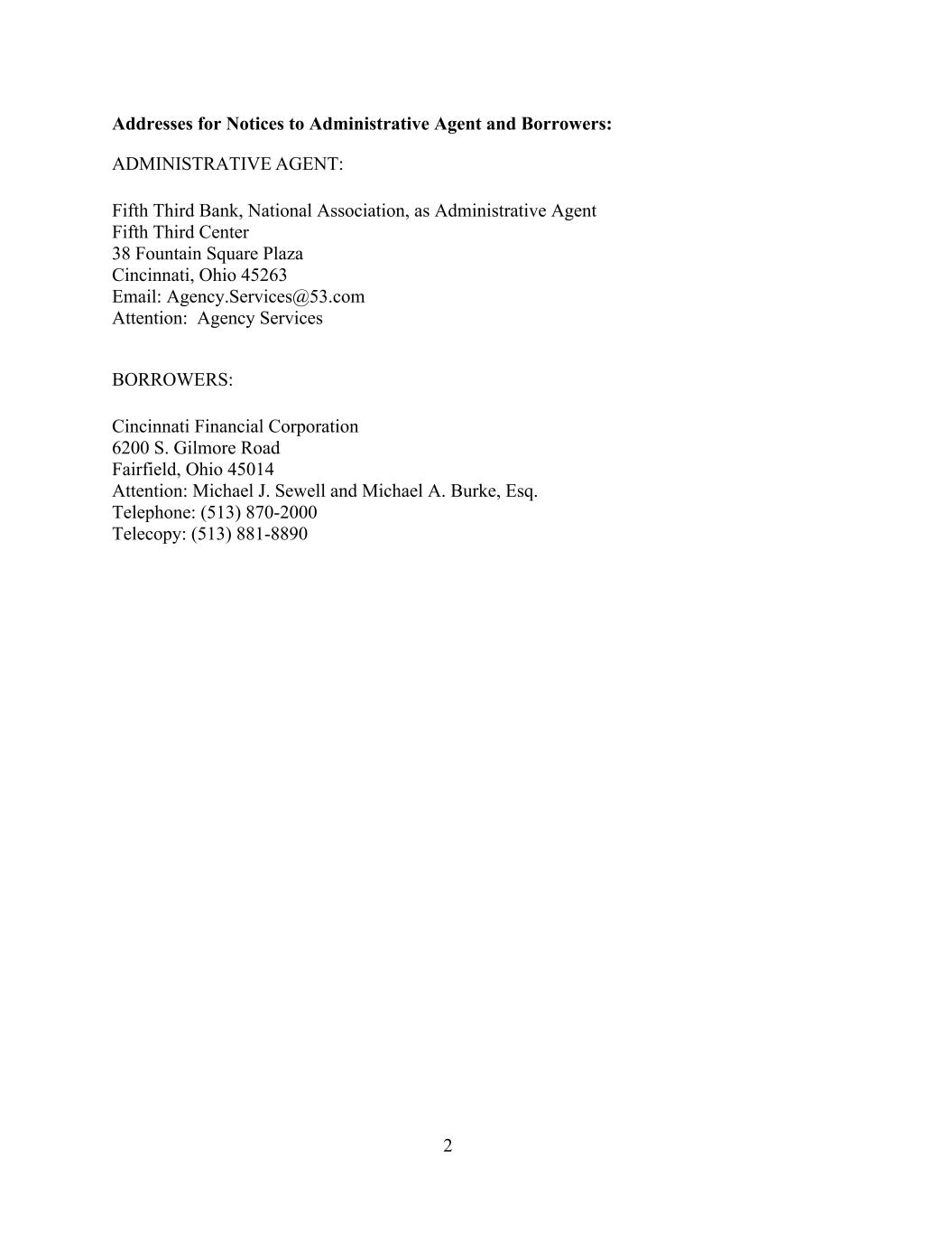2 Addresses for Notices to Administrative Agent and Borrowers: ADMINISTRATIVE AGENT: Fifth Third Bank, National Association, as Administrative Agent Fifth Third Center 38 Fountain Square Plaza Cincinnati, Ohio 45263 Email: Agency.Services@53.com Attention: Agency Services BORROWERS: Cincinnati Financial Corporation 6200 S. Gilmore Road Fairfield, Ohio 45014 Attention: Michael J. Sewell and Michael A. Burke, Esq. Telephone: (513) 870-2000 Telecopy: (513) 881-8890