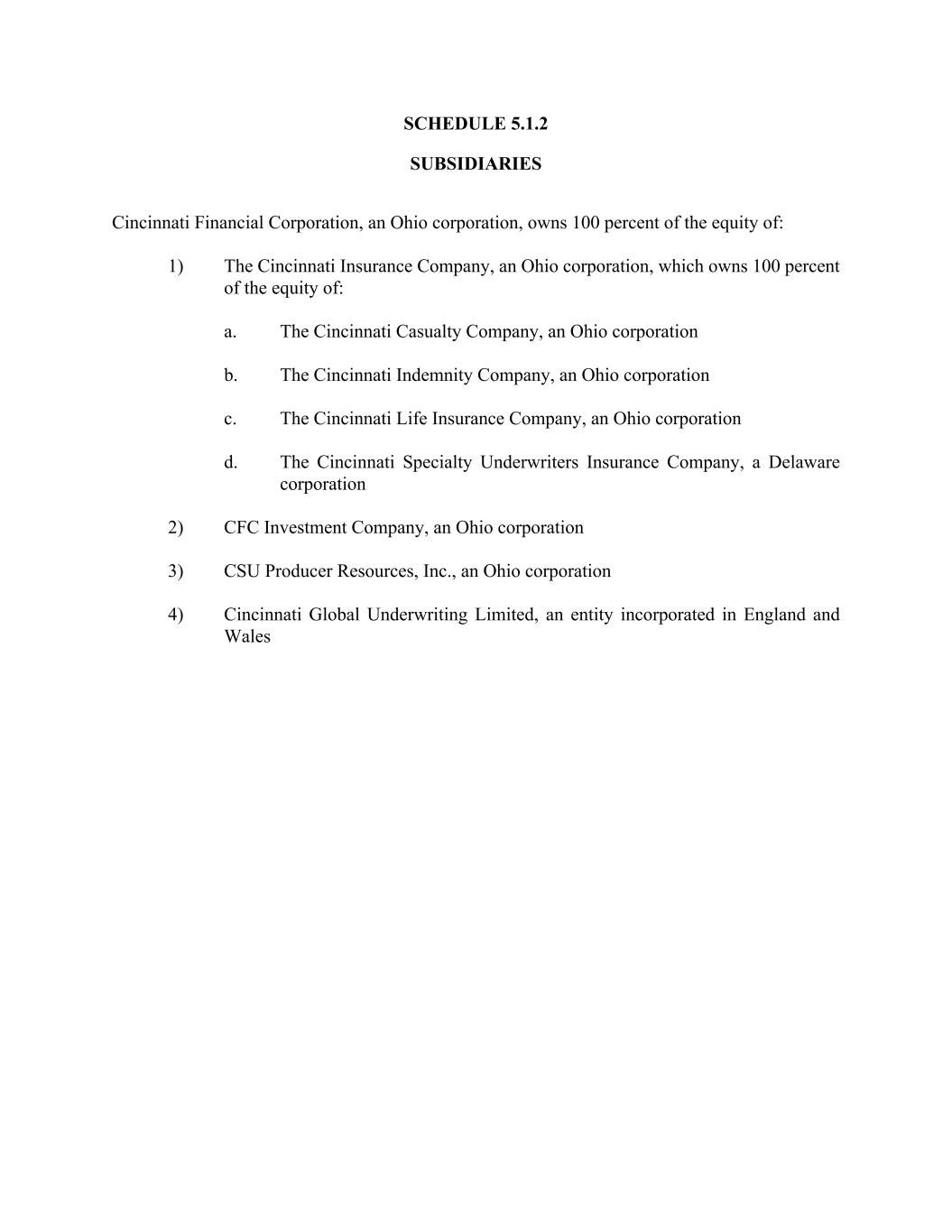 SCHEDULE 5.1.2 SUBSIDIARIES Cincinnati Financial Corporation, an Ohio corporation, owns 100 percent of the equity of: 1) The Cincinnati Insurance Company, an Ohio corporation, which owns 100 percent of the equity of: a. The Cincinnati Casualty Company, an Ohio corporation b. The Cincinnati Indemnity Company, an Ohio corporation c. The Cincinnati Life Insurance Company, an Ohio corporation d. The Cincinnati Specialty Underwriters Insurance Company, a Delaware corporation 2) CFC Investment Company, an Ohio corporation 3) CSU Producer Resources, Inc., an Ohio corporation 4) Cincinnati Global Underwriting Limited, an entity incorporated in England and Wales