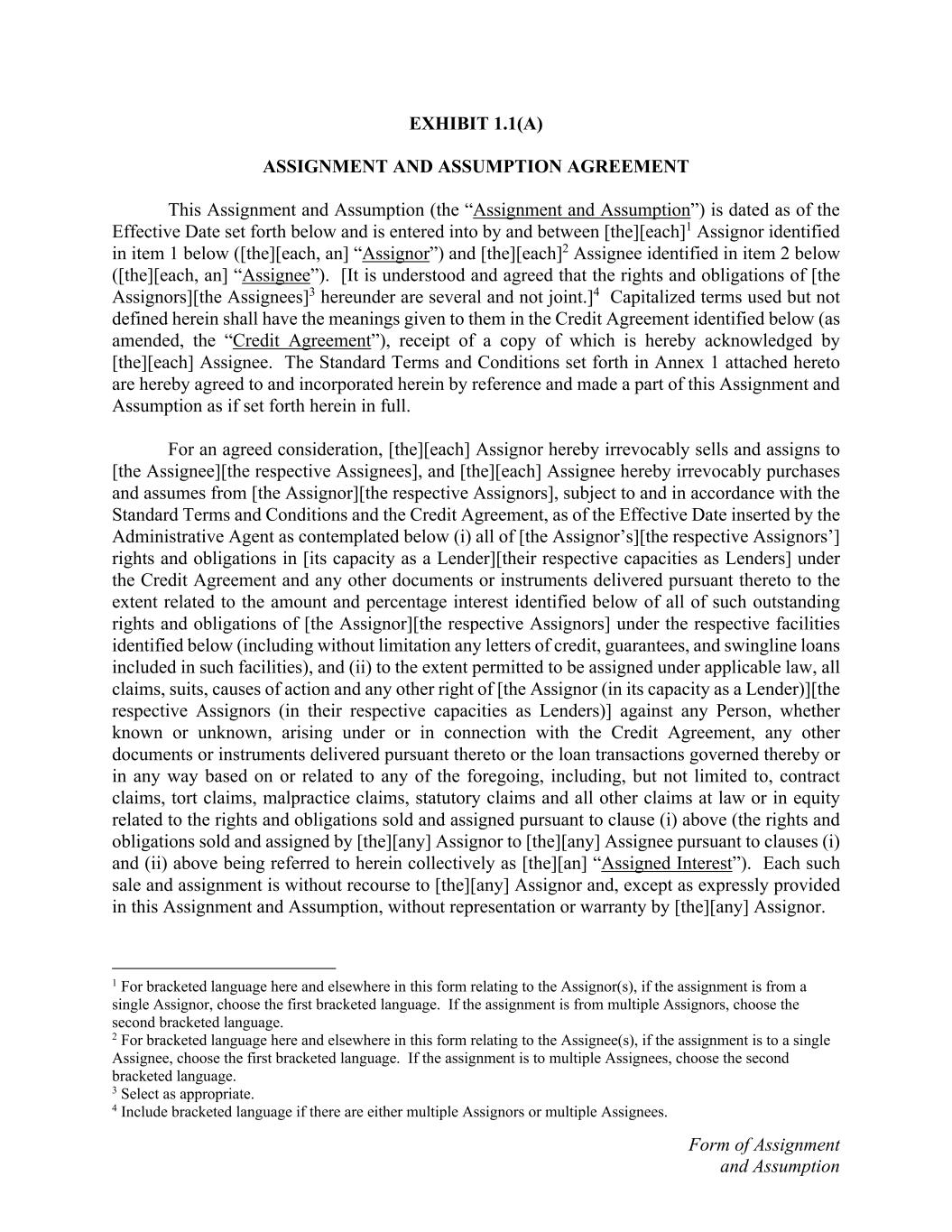 Form of Assignment and Assumption EXHIBIT 1.1(A) ASSIGNMENT AND ASSUMPTION AGREEMENT This Assignment and Assumption (the “Assignment and Assumption”) is dated as of the Effective Date set forth below and is entered into by and between [the][each]1 Assignor identified in item 1 below ([the][each, an] “Assignor”) and [the][each]2 Assignee identified in item 2 below ([the][each, an] “Assignee”). [It is understood and agreed that the rights and obligations of [the Assignors][the Assignees]3 hereunder are several and not joint.]4 Capitalized terms used but not defined herein shall have the meanings given to them in the Credit Agreement identified below (as amended, the “Credit Agreement”), receipt of a copy of which is hereby acknowledged by [the][each] Assignee. The Standard Terms and Conditions set forth in Annex 1 attached hereto are hereby agreed to and incorporated herein by reference and made a part of this Assignment and Assumption as if set forth herein in full. For an agreed consideration, [the][each] Assignor hereby irrevocably sells and assigns to [the Assignee][the respective Assignees], and [the][each] Assignee hereby irrevocably purchases and assumes from [the Assignor][the respective Assignors], subject to and in accordance with the Standard Terms and Conditions and the Credit Agreement, as of the Effective Date inserted by the Administrative Agent as contemplated below (i) all of [the Assignor’s][the respective Assignors’] rights and obligations in [its capacity as a Lender][their respective capacities as Lenders] under the Credit Agreement and any other documents or instruments delivered pursuant thereto to the extent related to the amount and percentage interest identified below of all of such outstanding rights and obligations of [the Assignor][the respective Assignors] under the respective facilities identified below (including without limitation any letters of credit, guarantees, and swingline loans included in such facilities), and (ii) to the extent permitted to be assigned under applicable law, all claims, suits, causes of action and any other right of [the Assignor (in its capacity as a Lender)][the respective Assignors (in their respective capacities as Lenders)] against any Person, whether known or unknown, arising under or in connection with the Credit Agreement, any other documents or instruments delivered pursuant thereto or the loan transactions governed thereby or in any way based on or related to any of the foregoing, including, but not limited to, contract claims, tort claims, malpractice claims, statutory claims and all other claims at law or in equity related to the rights and obligations sold and assigned pursuant to clause (i) above (the rights and obligations sold and assigned by [the][any] Assignor to [the][any] Assignee pursuant to clauses (i) and (ii) above being referred to herein collectively as [the][an] “Assigned Interest”). Each such sale and assignment is without recourse to [the][any] Assignor and, except as expressly provided in this Assignment and Assumption, without representation or warranty by [the][any] Assignor. 1 For bracketed language here and elsewhere in this form relating to the Assignor(s), if the assignment is from a single Assignor, choose the first bracketed language. If the assignment is from multiple Assignors, choose the second bracketed language. 2 For bracketed language here and elsewhere in this form relating to the Assignee(s), if the assignment is to a single Assignee, choose the first bracketed language. If the assignment is to multiple Assignees, choose the second bracketed language. 3 Select as appropriate. 4 Include bracketed language if there are either multiple Assignors or multiple Assignees.