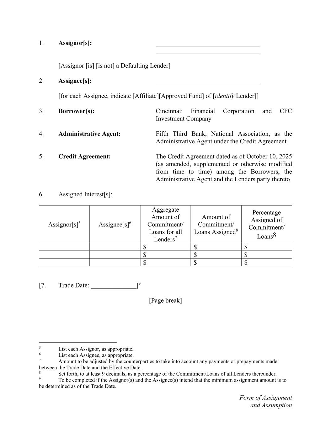 Form of Assignment and Assumption 1. Assignor[s]: ________________________________ ________________________________ [Assignor [is] [is not] a Defaulting Lender] 2. Assignee[s]: ________________________________ [for each Assignee, indicate [Affiliate][Approved Fund] of [identify Lender]] 3. Borrower(s): Cincinnati Financial Corporation and CFC Investment Company 4. Administrative Agent: Fifth Third Bank, National Association, as the Administrative Agent under the Credit Agreement 5. Credit Agreement: The Credit Agreement dated as of October 10, 2025 (as amended, supplemented or otherwise modified from time to time) among the Borrowers, the Administrative Agent and the Lenders party thereto 6. Assigned Interest[s]: Assignor[s]5 Assignee[s]6 Aggregate Amount of Commitment/ Loans for all Lenders7 Amount of Commitment/ Loans Assigned8 Percentage Assigned of Commitment/ Loans8 $ $ $ $ $ $ $ $ $ [7. Trade Date: ______________]9 [Page break] 5 List each Assignor, as appropriate. 6 List each Assignee, as appropriate. 7 Amount to be adjusted by the counterparties to take into account any payments or prepayments made between the Trade Date and the Effective Date. 8 Set forth, to at least 9 decimals, as a percentage of the Commitment/Loans of all Lenders thereunder. 9 To be completed if the Assignor(s) and the Assignee(s) intend that the minimum assignment amount is to be determined as of the Trade Date.