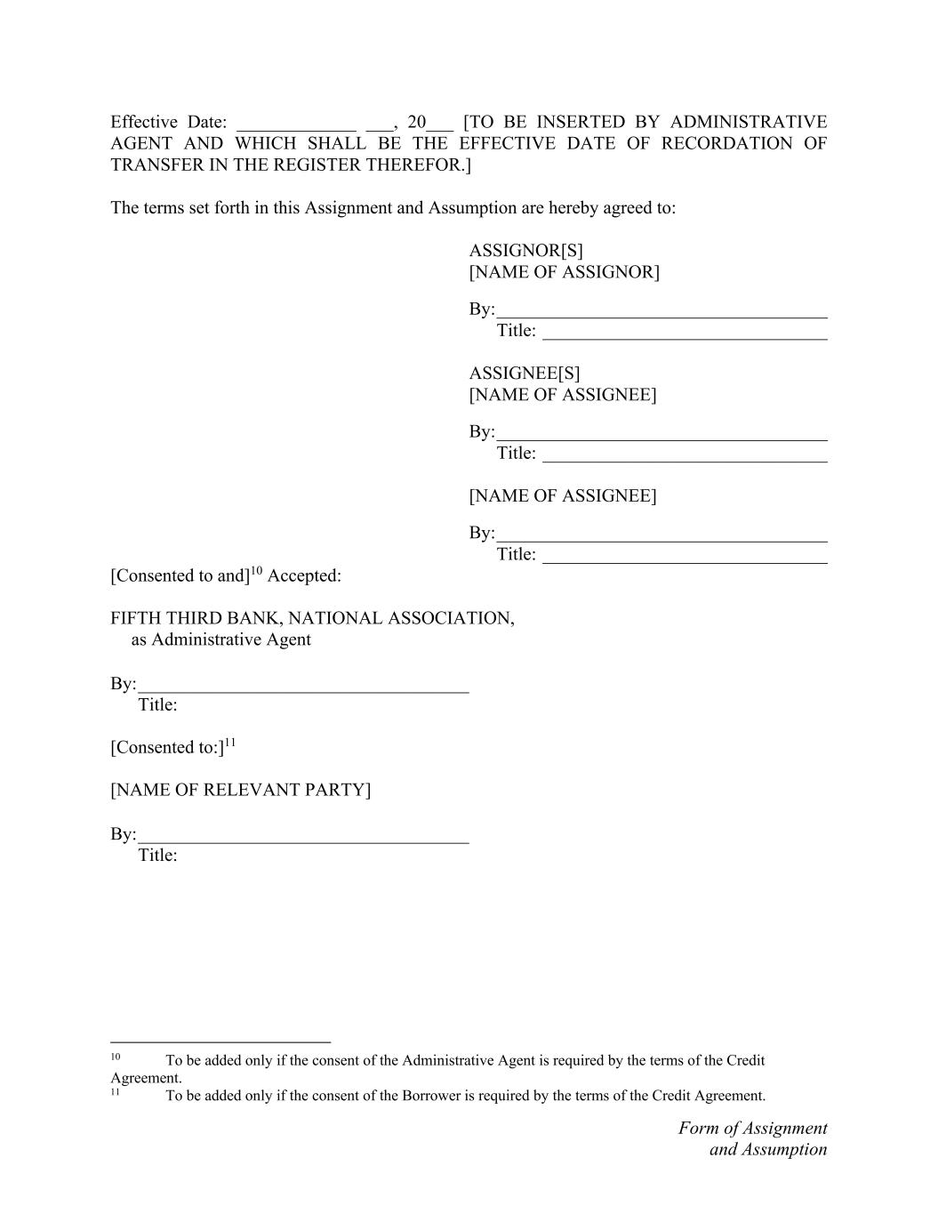 Form of Assignment and Assumption Effective Date: _____________ ___, 20___ [TO BE INSERTED BY ADMINISTRATIVE AGENT AND WHICH SHALL BE THE EFFECTIVE DATE OF RECORDATION OF TRANSFER IN THE REGISTER THEREFOR.] The terms set forth in this Assignment and Assumption are hereby agreed to: ASSIGNOR[S] [NAME OF ASSIGNOR] By: ____________________________________ Title: _______________________________ ASSIGNEE[S] [NAME OF ASSIGNEE] By: ____________________________________ Title: _______________________________ [NAME OF ASSIGNEE] By: ____________________________________ Title: _______________________________ [Consented to and]10 Accepted: FIFTH THIRD BANK, NATIONAL ASSOCIATION, as Administrative Agent By: ____________________________________ Title: [Consented to:]11 [NAME OF RELEVANT PARTY] By: ____________________________________ Title: 10 To be added only if the consent of the Administrative Agent is required by the terms of the Credit Agreement. 11 To be added only if the consent of the Borrower is required by the terms of the Credit Agreement.
