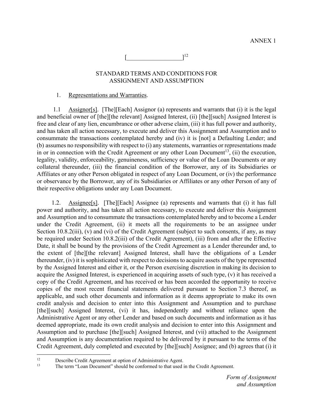 Form of Assignment and Assumption ANNEX 1 [__________________]12 STANDARD TERMS AND CONDITIONS FOR ASSIGNMENT AND ASSUMPTION 1. Representations and Warranties. 1.1 Assignor[s]. [The][Each] Assignor (a) represents and warrants that (i) it is the legal and beneficial owner of [the][the relevant] Assigned Interest, (ii) [the][such] Assigned Interest is free and clear of any lien, encumbrance or other adverse claim, (iii) it has full power and authority, and has taken all action necessary, to execute and deliver this Assignment and Assumption and to consummate the transactions contemplated hereby and (iv) it is [not] a Defaulting Lender; and (b) assumes no responsibility with respect to (i) any statements, warranties or representations made in or in connection with the Credit Agreement or any other Loan Document13, (ii) the execution, legality, validity, enforceability, genuineness, sufficiency or value of the Loan Documents or any collateral thereunder, (iii) the financial condition of the Borrower, any of its Subsidiaries or Affiliates or any other Person obligated in respect of any Loan Document, or (iv) the performance or observance by the Borrower, any of its Subsidiaries or Affiliates or any other Person of any of their respective obligations under any Loan Document. 1.2. Assignee[s]. [The][Each] Assignee (a) represents and warrants that (i) it has full power and authority, and has taken all action necessary, to execute and deliver this Assignment and Assumption and to consummate the transactions contemplated hereby and to become a Lender under the Credit Agreement, (ii) it meets all the requirements to be an assignee under Section 10.8.2(iii), (v) and (vi) of the Credit Agreement (subject to such consents, if any, as may be required under Section 10.8.2(iii) of the Credit Agreement), (iii) from and after the Effective Date, it shall be bound by the provisions of the Credit Agreement as a Lender thereunder and, to the extent of [the][the relevant] Assigned Interest, shall have the obligations of a Lender thereunder, (iv) it is sophisticated with respect to decisions to acquire assets of the type represented by the Assigned Interest and either it, or the Person exercising discretion in making its decision to acquire the Assigned Interest, is experienced in acquiring assets of such type, (v) it has received a copy of the Credit Agreement, and has received or has been accorded the opportunity to receive copies of the most recent financial statements delivered pursuant to Section 7.3 thereof, as applicable, and such other documents and information as it deems appropriate to make its own credit analysis and decision to enter into this Assignment and Assumption and to purchase [the][such] Assigned Interest, (vi) it has, independently and without reliance upon the Administrative Agent or any other Lender and based on such documents and information as it has deemed appropriate, made its own credit analysis and decision to enter into this Assignment and Assumption and to purchase [the][such] Assigned Interest, and (vii) attached to the Assignment and Assumption is any documentation required to be delivered by it pursuant to the terms of the Credit Agreement, duly completed and executed by [the][such] Assignee; and (b) agrees that (i) it 12 Describe Credit Agreement at option of Administrative Agent. 13 The term “Loan Document” should be conformed to that used in the Credit Agreement.