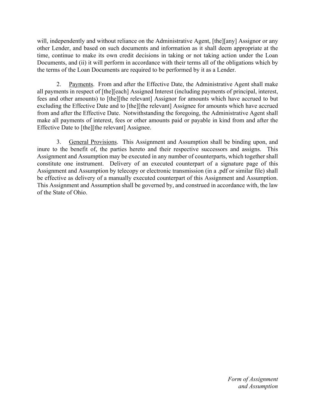 Form of Assignment and Assumption will, independently and without reliance on the Administrative Agent, [the][any] Assignor or any other Lender, and based on such documents and information as it shall deem appropriate at the time, continue to make its own credit decisions in taking or not taking action under the Loan Documents, and (ii) it will perform in accordance with their terms all of the obligations which by the terms of the Loan Documents are required to be performed by it as a Lender. 2. Payments. From and after the Effective Date, the Administrative Agent shall make all payments in respect of [the][each] Assigned Interest (including payments of principal, interest, fees and other amounts) to [the][the relevant] Assignor for amounts which have accrued to but excluding the Effective Date and to [the][the relevant] Assignee for amounts which have accrued from and after the Effective Date. Notwithstanding the foregoing, the Administrative Agent shall make all payments of interest, fees or other amounts paid or payable in kind from and after the Effective Date to [the][the relevant] Assignee. 3. General Provisions. This Assignment and Assumption shall be binding upon, and inure to the benefit of, the parties hereto and their respective successors and assigns. This Assignment and Assumption may be executed in any number of counterparts, which together shall constitute one instrument. Delivery of an executed counterpart of a signature page of this Assignment and Assumption by telecopy or electronic transmission (in a .pdf or similar file) shall be effective as delivery of a manually executed counterpart of this Assignment and Assumption. This Assignment and Assumption shall be governed by, and construed in accordance with, the law of the State of Ohio.