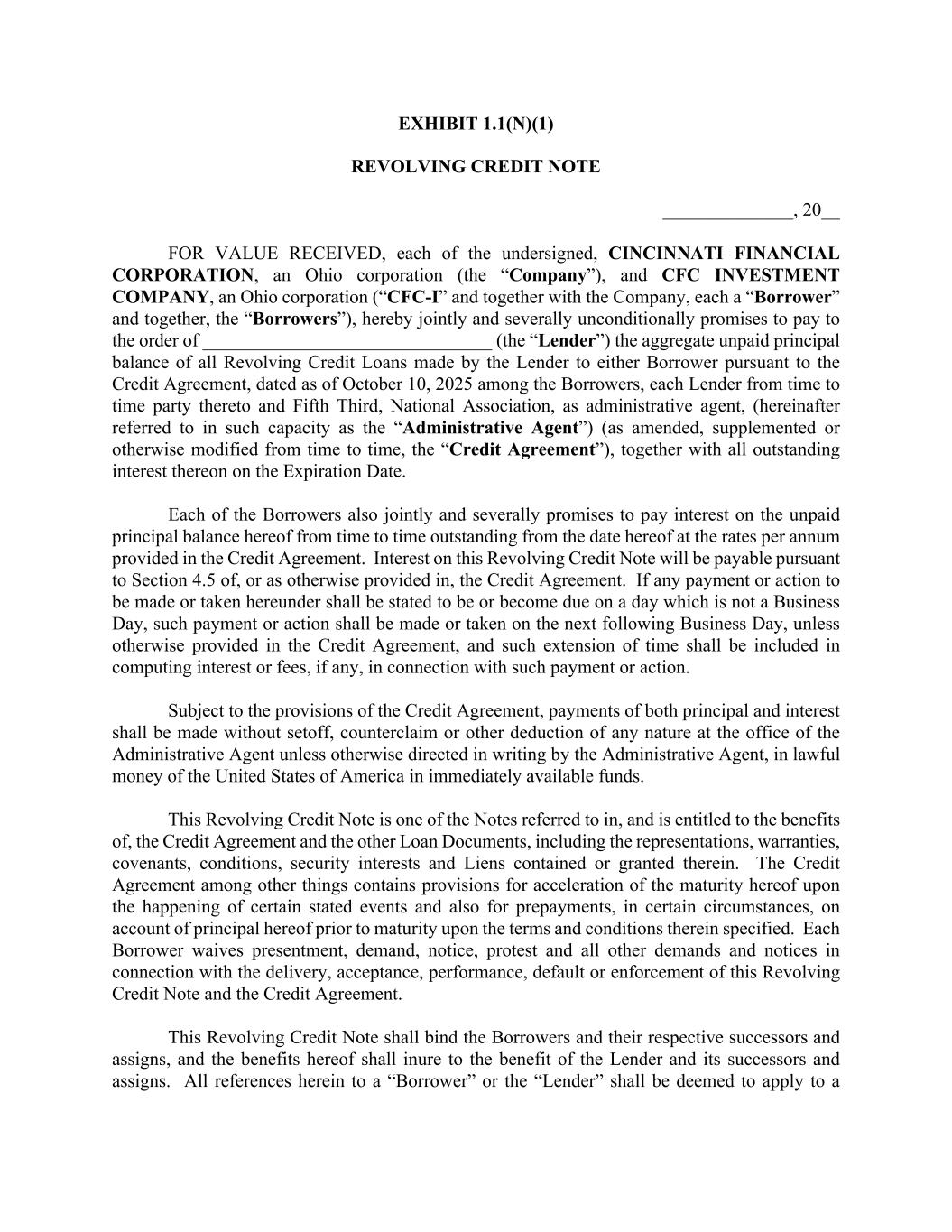 EXHIBIT 1.1(N)(1) REVOLVING CREDIT NOTE ______________, 20__ FOR VALUE RECEIVED, each of the undersigned, CINCINNATI FINANCIAL CORPORATION, an Ohio corporation (the “Company”), and CFC INVESTMENT COMPANY, an Ohio corporation (“CFC-I” and together with the Company, each a “Borrower” and together, the “Borrowers”), hereby jointly and severally unconditionally promises to pay to the order of _______________________________ (the “Lender”) the aggregate unpaid principal balance of all Revolving Credit Loans made by the Lender to either Borrower pursuant to the Credit Agreement, dated as of October 10, 2025 among the Borrowers, each Lender from time to time party thereto and Fifth Third, National Association, as administrative agent, (hereinafter referred to in such capacity as the “Administrative Agent”) (as amended, supplemented or otherwise modified from time to time, the “Credit Agreement”), together with all outstanding interest thereon on the Expiration Date. Each of the Borrowers also jointly and severally promises to pay interest on the unpaid principal balance hereof from time to time outstanding from the date hereof at the rates per annum provided in the Credit Agreement. Interest on this Revolving Credit Note will be payable pursuant to Section 4.5 of, or as otherwise provided in, the Credit Agreement. If any payment or action to be made or taken hereunder shall be stated to be or become due on a day which is not a Business Day, such payment or action shall be made or taken on the next following Business Day, unless otherwise provided in the Credit Agreement, and such extension of time shall be included in computing interest or fees, if any, in connection with such payment or action. Subject to the provisions of the Credit Agreement, payments of both principal and interest shall be made without setoff, counterclaim or other deduction of any nature at the office of the Administrative Agent unless otherwise directed in writing by the Administrative Agent, in lawful money of the United States of America in immediately available funds. This Revolving Credit Note is one of the Notes referred to in, and is entitled to the benefits of, the Credit Agreement and the other Loan Documents, including the representations, warranties, covenants, conditions, security interests and Liens contained or granted therein. The Credit Agreement among other things contains provisions for acceleration of the maturity hereof upon the happening of certain stated events and also for prepayments, in certain circumstances, on account of principal hereof prior to maturity upon the terms and conditions therein specified. Each Borrower waives presentment, demand, notice, protest and all other demands and notices in connection with the delivery, acceptance, performance, default or enforcement of this Revolving Credit Note and the Credit Agreement. This Revolving Credit Note shall bind the Borrowers and their respective successors and assigns, and the benefits hereof shall inure to the benefit of the Lender and its successors and assigns. All references herein to a “Borrower” or the “Lender” shall be deemed to apply to a