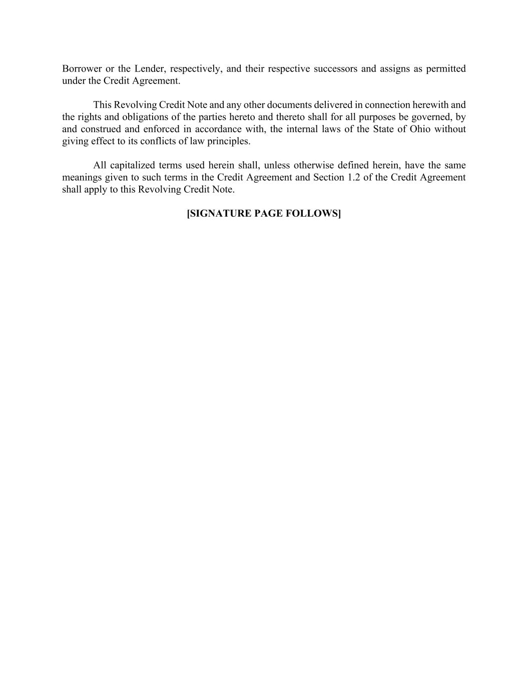 Borrower or the Lender, respectively, and their respective successors and assigns as permitted under the Credit Agreement. This Revolving Credit Note and any other documents delivered in connection herewith and the rights and obligations of the parties hereto and thereto shall for all purposes be governed, by and construed and enforced in accordance with, the internal laws of the State of Ohio without giving effect to its conflicts of law principles. All capitalized terms used herein shall, unless otherwise defined herein, have the same meanings given to such terms in the Credit Agreement and Section 1.2 of the Credit Agreement shall apply to this Revolving Credit Note. [SIGNATURE PAGE FOLLOWS]