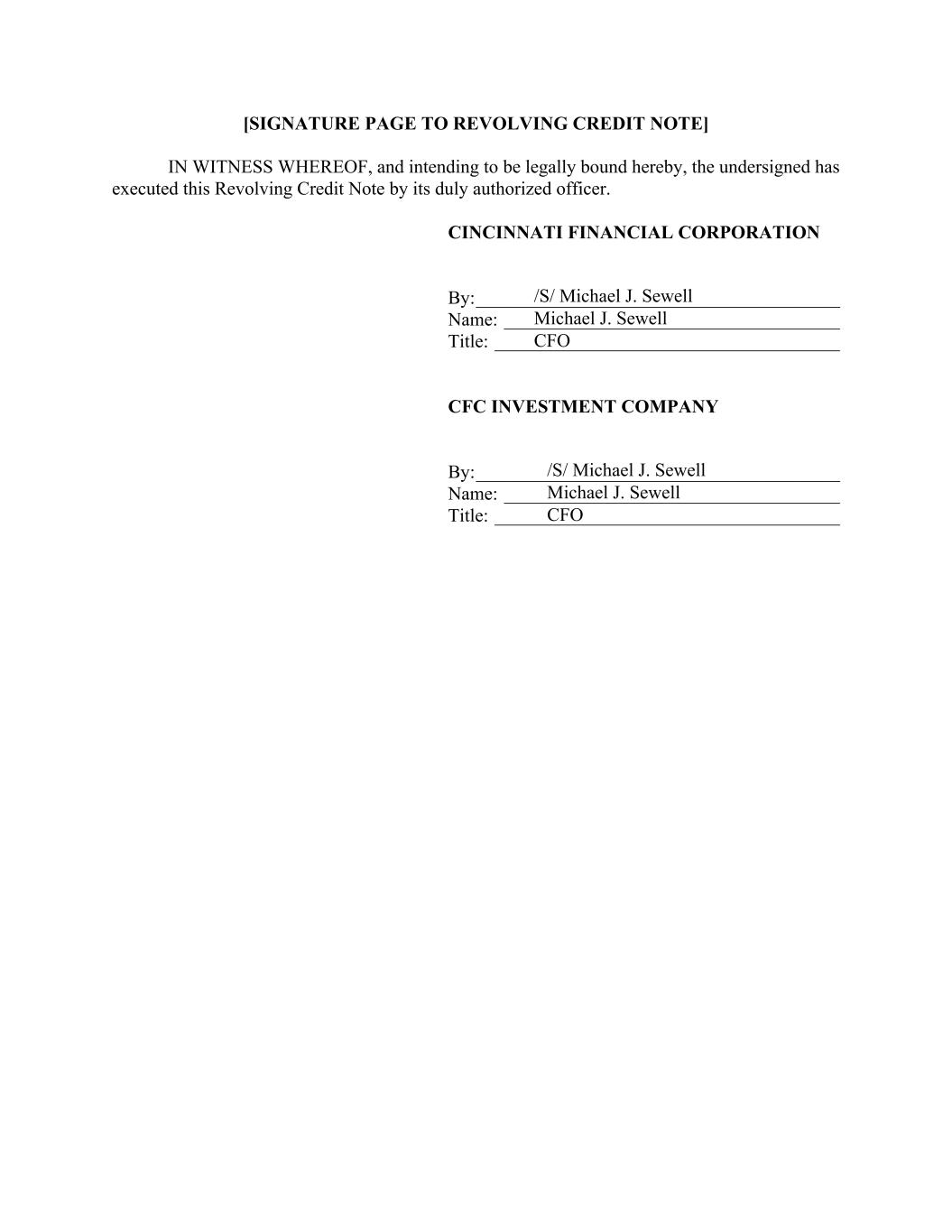 [SIGNATURE PAGE TO REVOLVING CREDIT NOTE] IN WITNESS WHEREOF, and intending to be legally bound hereby, the undersigned has executed this Revolving Credit Note by its duly authorized officer. CINCINNATI FINANCIAL CORPORATION By: _______________________________________ Name: ____________________________________ Title: _____________________________________ CFC INVESTMENT COMPANY By: _______________________________________ Name: ____________________________________ Title: _____________________________________ /S/ Michael J. Sewell Michael J. Sewell CFO /S/ Michael J. Sewell Michael J. Sewell CFO