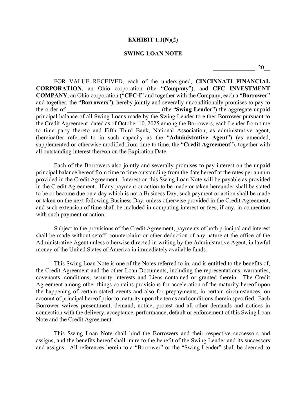 EXHIBIT 1.1(N)(2) SWING LOAN NOTE ______________, 20__ FOR VALUE RECEIVED, each of the undersigned, CINCINNATI FINANCIAL CORPORATION, an Ohio corporation (the “Company”), and CFC INVESTMENT COMPANY, an Ohio corporation (“CFC-I” and together with the Company, each a “Borrower” and together, the “Borrowers”), hereby jointly and severally unconditionally promises to pay to the order of _______________________________ (the “Swing Lender”) the aggregate unpaid principal balance of all Swing Loans made by the Swing Lender to either Borrower pursuant to the Credit Agreement, dated as of October 10, 2025 among the Borrowers, each Lender from time to time party thereto and Fifth Third Bank, National Association, as administrative agent, (hereinafter referred to in such capacity as the “Administrative Agent”) (as amended, supplemented or otherwise modified from time to time, the “Credit Agreement”), together with all outstanding interest thereon on the Expiration Date. Each of the Borrowers also jointly and severally promises to pay interest on the unpaid principal balance hereof from time to time outstanding from the date hereof at the rates per annum provided in the Credit Agreement. Interest on this Swing Loan Note will be payable as provided in the Credit Agreement. If any payment or action to be made or taken hereunder shall be stated to be or become due on a day which is not a Business Day, such payment or action shall be made or taken on the next following Business Day, unless otherwise provided in the Credit Agreement, and such extension of time shall be included in computing interest or fees, if any, in connection with such payment or action. Subject to the provisions of the Credit Agreement, payments of both principal and interest shall be made without setoff, counterclaim or other deduction of any nature at the office of the Administrative Agent unless otherwise directed in writing by the Administrative Agent, in lawful money of the United States of America in immediately available funds. This Swing Loan Note is one of the Notes referred to in, and is entitled to the benefits of, the Credit Agreement and the other Loan Documents, including the representations, warranties, covenants, conditions, security interests and Liens contained or granted therein. The Credit Agreement among other things contains provisions for acceleration of the maturity hereof upon the happening of certain stated events and also for prepayments, in certain circumstances, on account of principal hereof prior to maturity upon the terms and conditions therein specified. Each Borrower waives presentment, demand, notice, protest and all other demands and notices in connection with the delivery, acceptance, performance, default or enforcement of this Swing Loan Note and the Credit Agreement. This Swing Loan Note shall bind the Borrowers and their respective successors and assigns, and the benefits hereof shall inure to the benefit of the Swing Lender and its successors and assigns. All references herein to a “Borrower” or the “Swing Lender” shall be deemed to