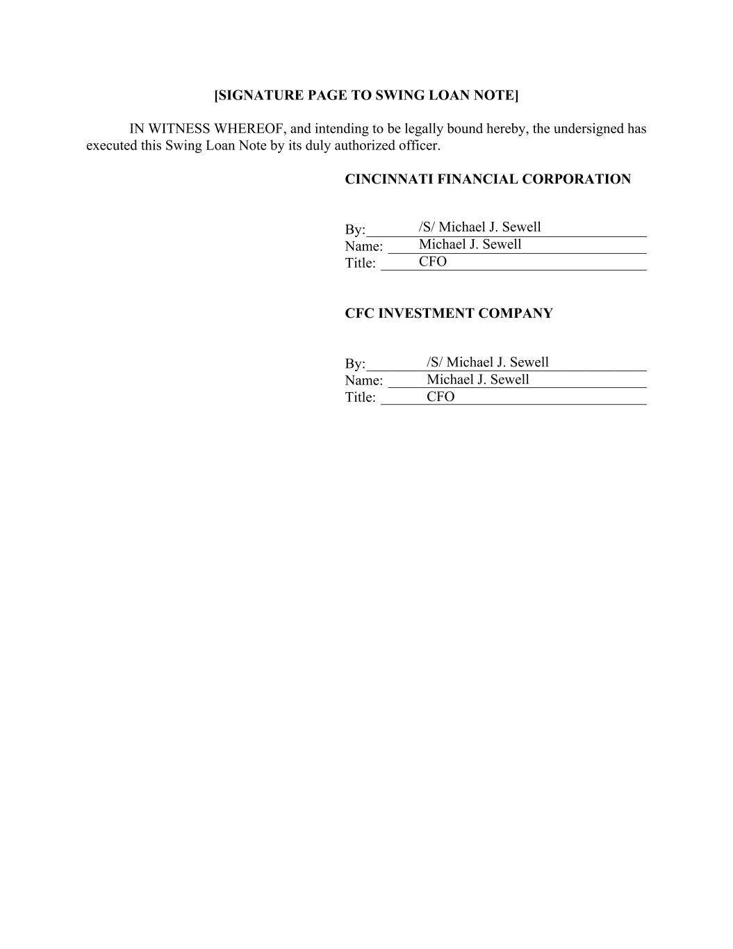 [SIGNATURE PAGE TO SWING LOAN NOTE] IN WITNESS WHEREOF, and intending to be legally bound hereby, the undersigned has executed this Swing Loan Note by its duly authorized officer. CINCINNATI FINANCIAL CORPORATION By: _______________________________________ Name: ____________________________________ Title: _____________________________________ CFC INVESTMENT COMPANY By: _______________________________________ Name: ____________________________________ Title: _____________________________________ /S/ Michael J. Sewell Michael J. Sewell CFO /S/ Michael J. Sewell Michael J. Sewell CFO