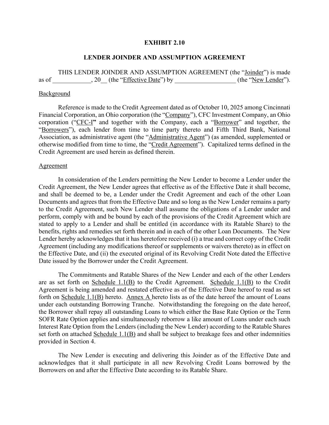 EXHIBIT 2.10 LENDER JOINDER AND ASSUMPTION AGREEMENT THIS LENDER JOINDER AND ASSUMPTION AGREEMENT (the “Joinder”) is made as of ____________, 20__ (the “Effective Date”) by ___________________ (the “New Lender”). Background Reference is made to the Credit Agreement dated as of October 10, 2025 among Cincinnati Financial Corporation, an Ohio corporation (the “Company”), CFC Investment Company, an Ohio corporation (“CFC-I” and together with the Company, each a “Borrower” and together, the “Borrowers”), each lender from time to time party thereto and Fifth Third Bank, National Association, as administrative agent (the “Administrative Agent”) (as amended, supplemented or otherwise modified from time to time, the “Credit Agreement”). Capitalized terms defined in the Credit Agreement are used herein as defined therein. Agreement In consideration of the Lenders permitting the New Lender to become a Lender under the Credit Agreement, the New Lender agrees that effective as of the Effective Date it shall become, and shall be deemed to be, a Lender under the Credit Agreement and each of the other Loan Documents and agrees that from the Effective Date and so long as the New Lender remains a party to the Credit Agreement, such New Lender shall assume the obligations of a Lender under and perform, comply with and be bound by each of the provisions of the Credit Agreement which are stated to apply to a Lender and shall be entitled (in accordance with its Ratable Share) to the benefits, rights and remedies set forth therein and in each of the other Loan Documents. The New Lender hereby acknowledges that it has heretofore received (i) a true and correct copy of the Credit Agreement (including any modifications thereof or supplements or waivers thereto) as in effect on the Effective Date, and (ii) the executed original of its Revolving Credit Note dated the Effective Date issued by the Borrower under the Credit Agreement. The Commitments and Ratable Shares of the New Lender and each of the other Lenders are as set forth on Schedule 1.1(B) to the Credit Agreement. Schedule 1.1(B) to the Credit Agreement is being amended and restated effective as of the Effective Date hereof to read as set forth on Schedule 1.1(B) hereto. Annex A hereto lists as of the date hereof the amount of Loans under each outstanding Borrowing Tranche. Notwithstanding the foregoing on the date hereof, the Borrower shall repay all outstanding Loans to which either the Base Rate Option or the Term SOFR Rate Option applies and simultaneously reborrow a like amount of Loans under each such Interest Rate Option from the Lenders (including the New Lender) according to the Ratable Shares set forth on attached Schedule 1.1(B) and shall be subject to breakage fees and other indemnities provided in Section 4. The New Lender is executing and delivering this Joinder as of the Effective Date and acknowledges that it shall participate in all new Revolving Credit Loans borrowed by the Borrowers on and after the Effective Date according to its Ratable Share.