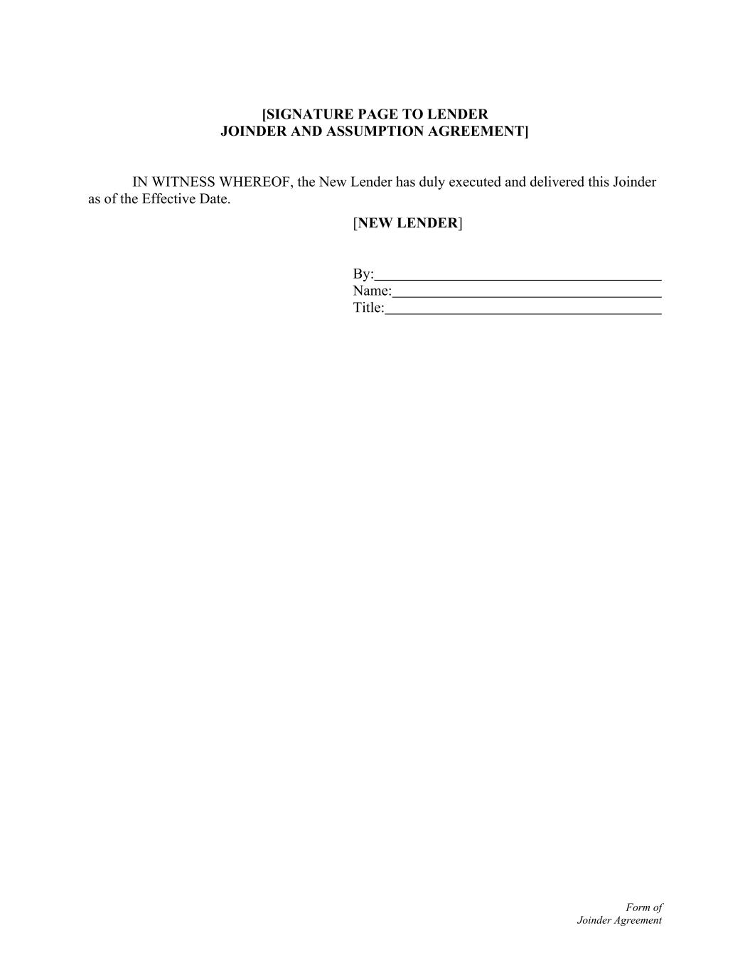 Form of Joinder Agreement [SIGNATURE PAGE TO LENDER JOINDER AND ASSUMPTION AGREEMENT] IN WITNESS WHEREOF, the New Lender has duly executed and delivered this Joinder as of the Effective Date. [NEW LENDER] By: Name: Title: