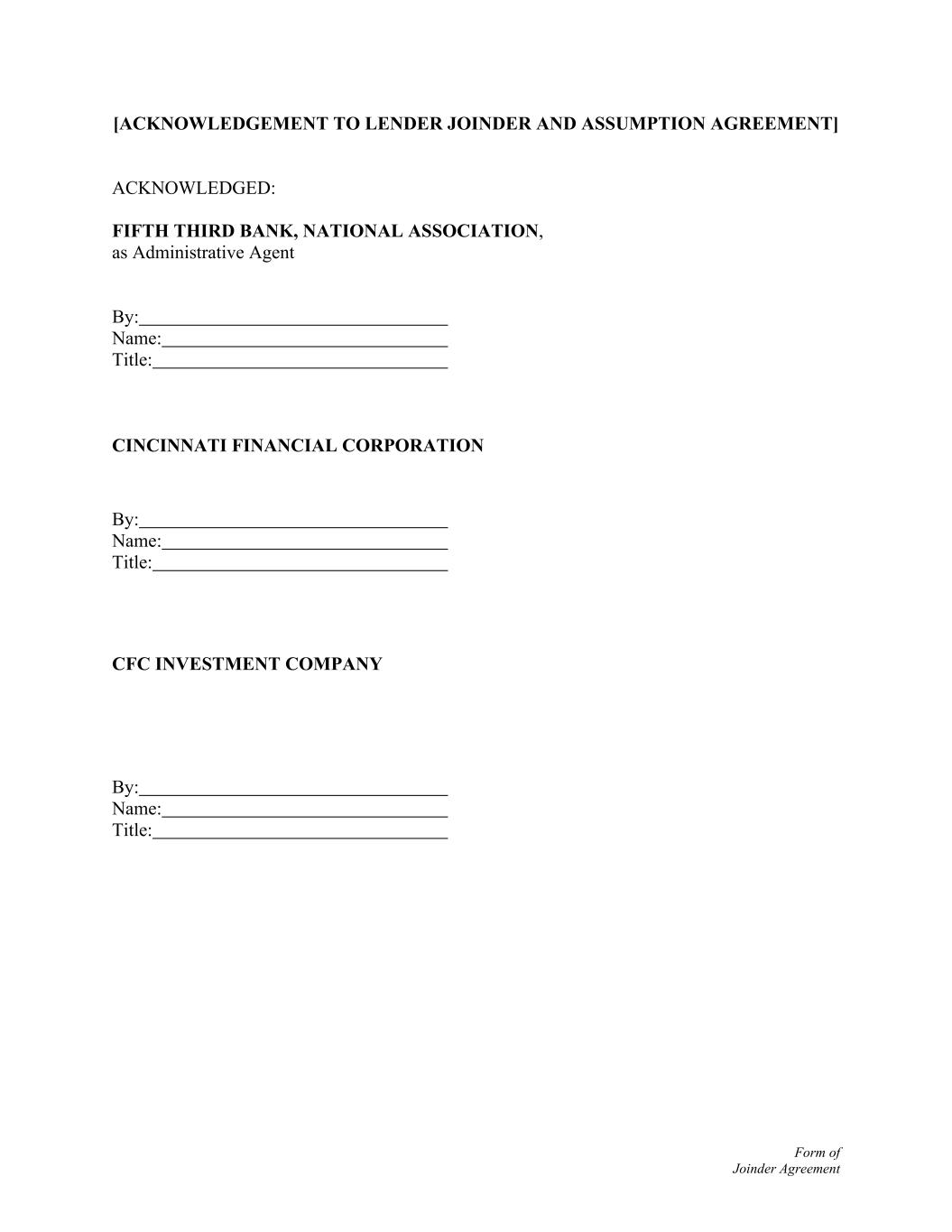 Form of Joinder Agreement [ACKNOWLEDGEMENT TO LENDER JOINDER AND ASSUMPTION AGREEMENT] ACKNOWLEDGED: FIFTH THIRD BANK, NATIONAL ASSOCIATION, as Administrative Agent By: Name: Title: CINCINNATI FINANCIAL CORPORATION By: Name: Title: CFC INVESTMENT COMPANY By: Name: Title:
