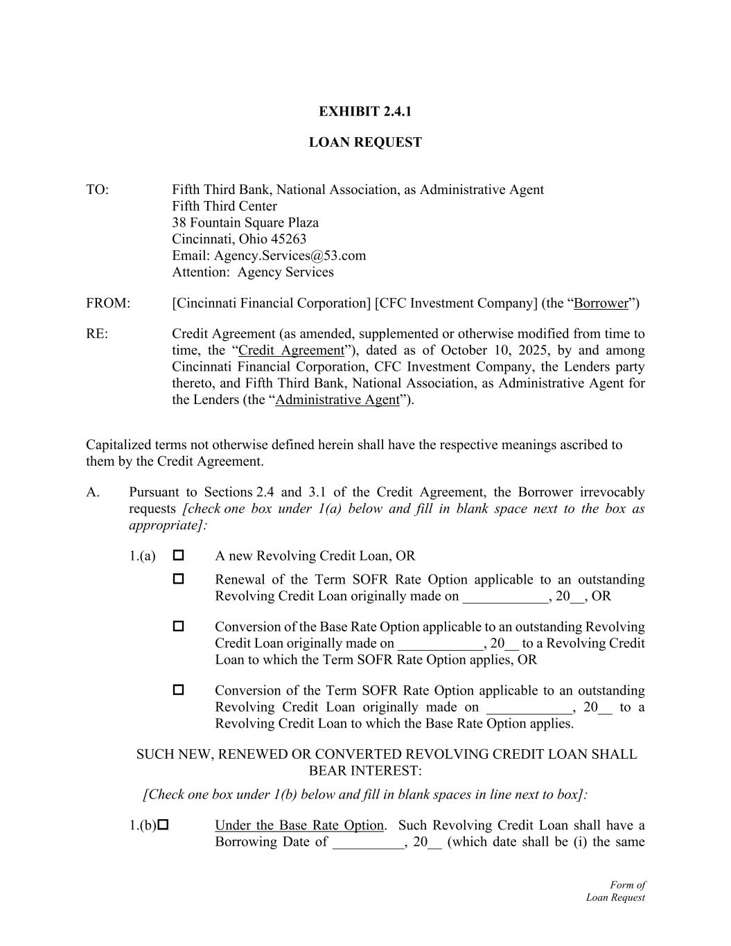Form of Loan Request EXHIBIT 2.4.1 LOAN REQUEST TO: Fifth Third Bank, National Association, as Administrative Agent Fifth Third Center 38 Fountain Square Plaza Cincinnati, Ohio 45263 Email: Agency.Services@53.com Attention: Agency Services FROM: [Cincinnati Financial Corporation] [CFC Investment Company] (the “Borrower”) RE: Credit Agreement (as amended, supplemented or otherwise modified from time to time, the “Credit Agreement”), dated as of October 10, 2025, by and among Cincinnati Financial Corporation, CFC Investment Company, the Lenders party thereto, and Fifth Third Bank, National Association, as Administrative Agent for the Lenders (the “Administrative Agent”). Capitalized terms not otherwise defined herein shall have the respective meanings ascribed to them by the Credit Agreement. A. Pursuant to Sections 2.4 and 3.1 of the Credit Agreement, the Borrower irrevocably requests [check one box under 1(a) below and fill in blank space next to the box as appropriate]: 1.(a)  A new Revolving Credit Loan, OR  Renewal of the Term SOFR Rate Option applicable to an outstanding Revolving Credit Loan originally made on ____________, 20__, OR  Conversion of the Base Rate Option applicable to an outstanding Revolving Credit Loan originally made on ____________, 20__ to a Revolving Credit Loan to which the Term SOFR Rate Option applies, OR  Conversion of the Term SOFR Rate Option applicable to an outstanding Revolving Credit Loan originally made on ____________, 20__ to a Revolving Credit Loan to which the Base Rate Option applies. SUCH NEW, RENEWED OR CONVERTED REVOLVING CREDIT LOAN SHALL BEAR INTEREST: [Check one box under 1(b) below and fill in blank spaces in line next to box]: 1.(b) Under the Base Rate Option. Such Revolving Credit Loan shall have a Borrowing Date of __________, 20__ (which date shall be (i) the same