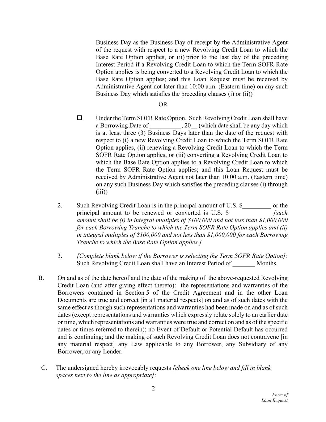 2 Form of Loan Request Business Day as the Business Day of receipt by the Administrative Agent of the request with respect to a new Revolving Credit Loan to which the Base Rate Option applies, or (ii) prior to the last day of the preceding Interest Period if a Revolving Credit Loan to which the Term SOFR Rate Option applies is being converted to a Revolving Credit Loan to which the Base Rate Option applies; and this Loan Request must be received by Administrative Agent not later than 10:00 a.m. (Eastern time) on any such Business Day which satisfies the preceding clauses (i) or (ii)) OR  Under the Term SOFR Rate Option. Such Revolving Credit Loan shall have a Borrowing Date of __________, 20__ (which date shall be any day which is at least three (3) Business Days later than the date of the request with respect to (i) a new Revolving Credit Loan to which the Term SOFR Rate Option applies, (ii) renewing a Revolving Credit Loan to which the Term SOFR Rate Option applies, or (iii) converting a Revolving Credit Loan to which the Base Rate Option applies to a Revolving Credit Loan to which the Term SOFR Rate Option applies; and this Loan Request must be received by Administrative Agent not later than 10:00 a.m. (Eastern time) on any such Business Day which satisfies the preceding clauses (i) through (iii)) 2. Such Revolving Credit Loan is in the principal amount of U.S. $_________ or the principal amount to be renewed or converted is U.S. $_____________ [such amount shall be (i) in integral multiples of $100,000 and not less than $1,000,000 for each Borrowing Tranche to which the Term SOFR Rate Option applies and (ii) in integral multiples of $100,000 and not less than $1,000,000 for each Borrowing Tranche to which the Base Rate Option applies.] 3. [Complete blank below if the Borrower is selecting the Term SOFR Rate Option]: Such Revolving Credit Loan shall have an Interest Period of _______ Months. B. On and as of the date hereof and the date of the making of the above-requested Revolving Credit Loan (and after giving effect thereto): the representations and warranties of the Borrowers contained in Section 5 of the Credit Agreement and in the other Loan Documents are true and correct [in all material respects] on and as of such dates with the same effect as though such representations and warranties had been made on and as of such dates (except representations and warranties which expressly relate solely to an earlier date or time, which representations and warranties were true and correct on and as of the specific dates or times referred to therein); no Event of Default or Potential Default has occurred and is continuing; and the making of such Revolving Credit Loan does not contravene [in any material respect] any Law applicable to any Borrower, any Subsidiary of any Borrower, or any Lender. C. The undersigned hereby irrevocably requests [check one line below and fill in blank spaces next to the line as appropriate]: