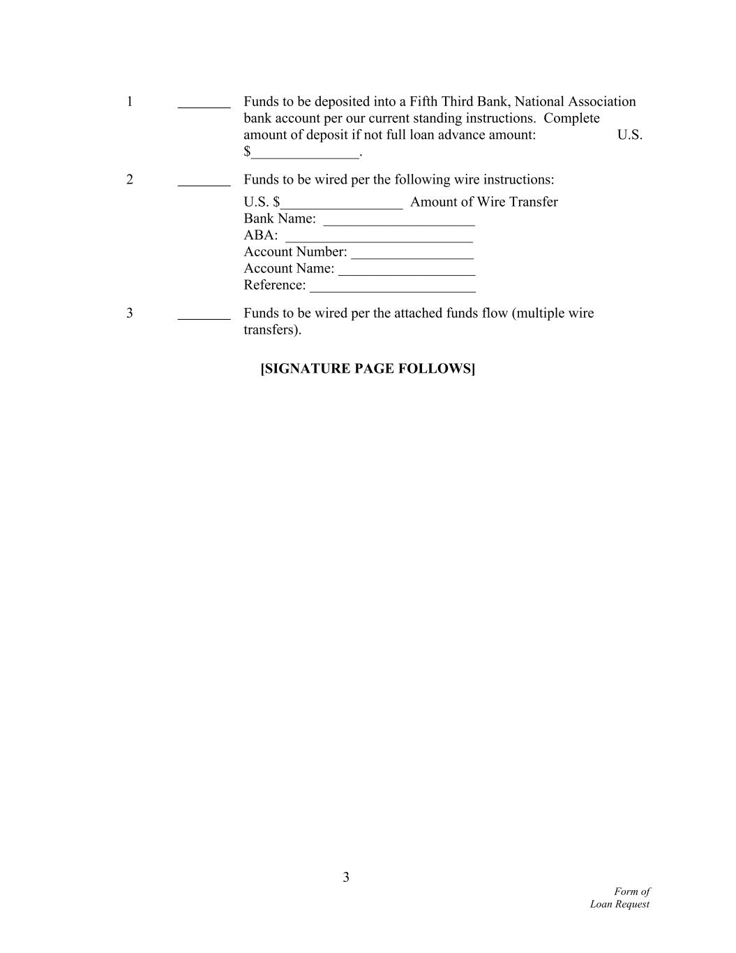 3 Form of Loan Request 1 Funds to be deposited into a Fifth Third Bank, National Association bank account per our current standing instructions. Complete amount of deposit if not full loan advance amount: U.S. $_______________. 2 Funds to be wired per the following wire instructions: U.S. $_________________ Amount of Wire Transfer Bank Name: _____________________ ABA: __________________________ Account Number: _________________ Account Name: ___________________ Reference: _______________________ 3 Funds to be wired per the attached funds flow (multiple wire transfers). [SIGNATURE PAGE FOLLOWS]