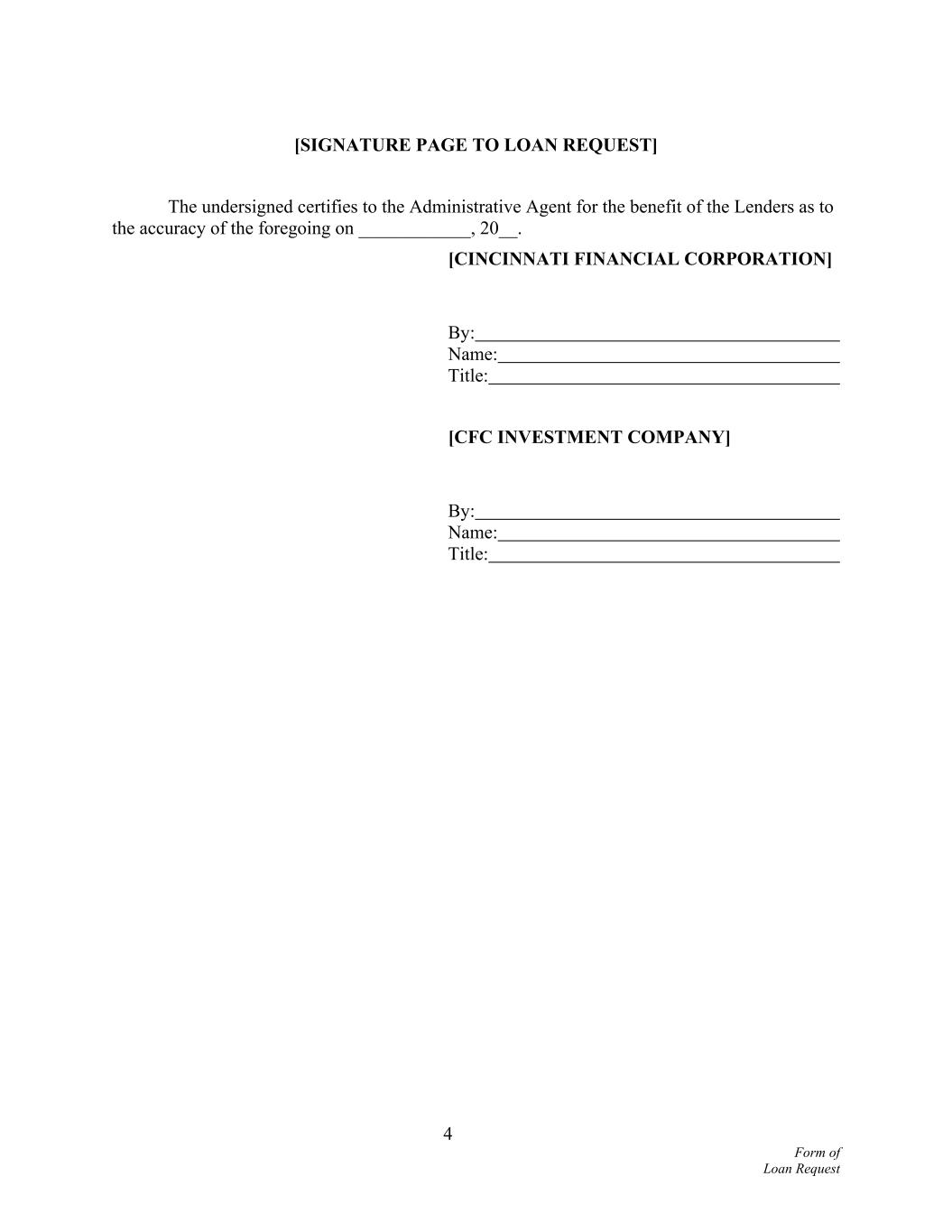 4 Form of Loan Request [SIGNATURE PAGE TO LOAN REQUEST] The undersigned certifies to the Administrative Agent for the benefit of the Lenders as to the accuracy of the foregoing on ____________, 20__. [CINCINNATI FINANCIAL CORPORATION] By: Name: Title: [CFC INVESTMENT COMPANY] By: Name: Title: