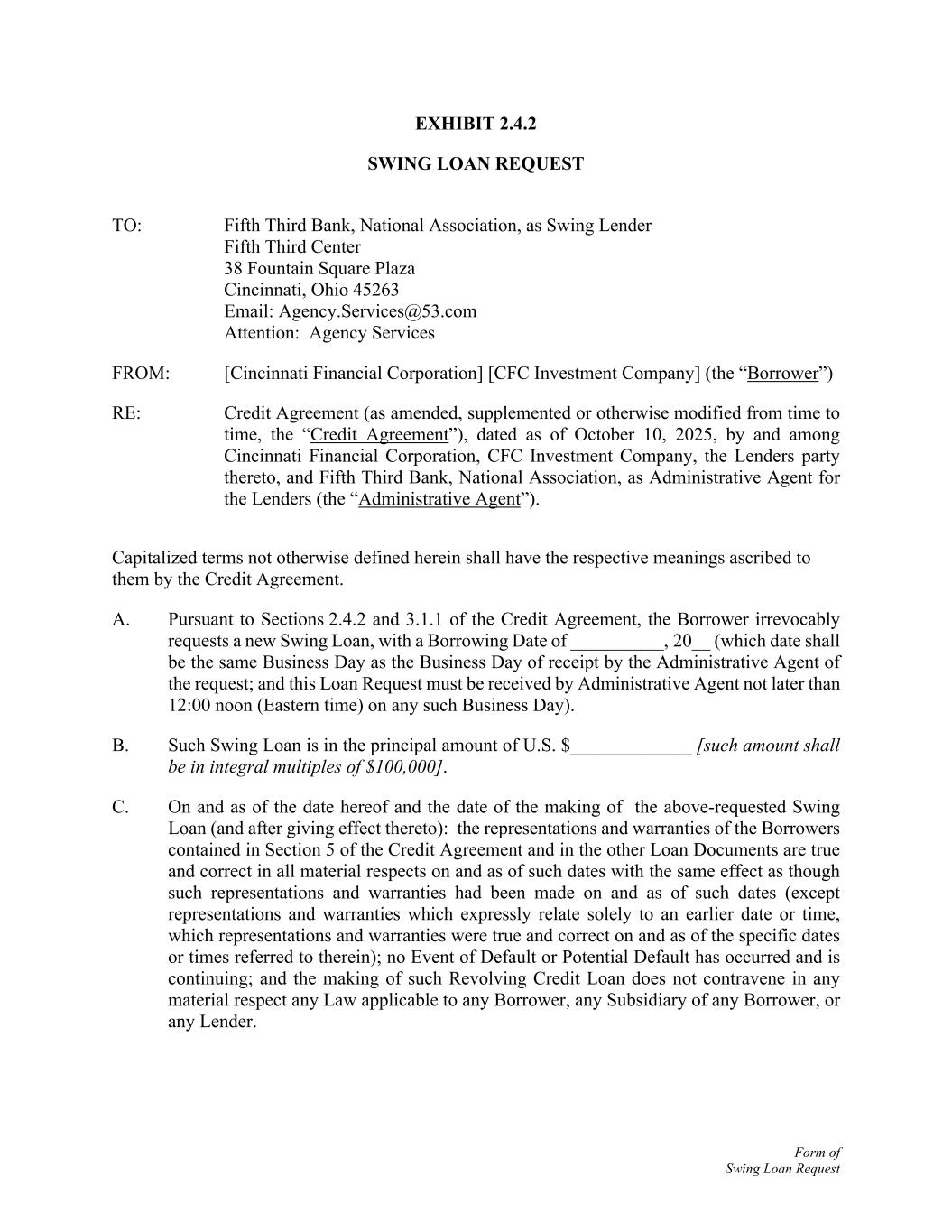 Form of Swing Loan Request EXHIBIT 2.4.2 SWING LOAN REQUEST TO: Fifth Third Bank, National Association, as Swing Lender Fifth Third Center 38 Fountain Square Plaza Cincinnati, Ohio 45263 Email: Agency.Services@53.com Attention: Agency Services FROM: [Cincinnati Financial Corporation] [CFC Investment Company] (the “Borrower”) RE: Credit Agreement (as amended, supplemented or otherwise modified from time to time, the “Credit Agreement”), dated as of October 10, 2025, by and among Cincinnati Financial Corporation, CFC Investment Company, the Lenders party thereto, and Fifth Third Bank, National Association, as Administrative Agent for the Lenders (the “Administrative Agent”). Capitalized terms not otherwise defined herein shall have the respective meanings ascribed to them by the Credit Agreement. A. Pursuant to Sections 2.4.2 and 3.1.1 of the Credit Agreement, the Borrower irrevocably requests a new Swing Loan, with a Borrowing Date of __________, 20__ (which date shall be the same Business Day as the Business Day of receipt by the Administrative Agent of the request; and this Loan Request must be received by Administrative Agent not later than 12:00 noon (Eastern time) on any such Business Day). B. Such Swing Loan is in the principal amount of U.S. $_____________ [such amount shall be in integral multiples of $100,000]. C. On and as of the date hereof and the date of the making of the above-requested Swing Loan (and after giving effect thereto): the representations and warranties of the Borrowers contained in Section 5 of the Credit Agreement and in the other Loan Documents are true and correct in all material respects on and as of such dates with the same effect as though such representations and warranties had been made on and as of such dates (except representations and warranties which expressly relate solely to an earlier date or time, which representations and warranties were true and correct on and as of the specific dates or times referred to therein); no Event of Default or Potential Default has occurred and is continuing; and the making of such Revolving Credit Loan does not contravene in any material respect any Law applicable to any Borrower, any Subsidiary of any Borrower, or any Lender.