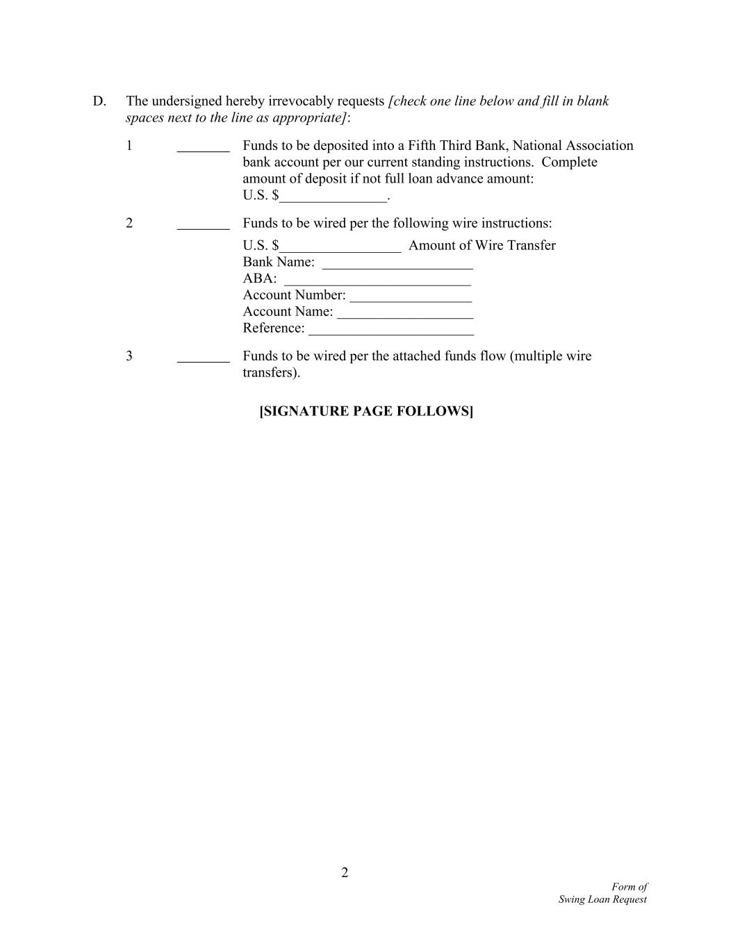 2 Form of Swing Loan Request D. The undersigned hereby irrevocably requests [check one line below and fill in blank spaces next to the line as appropriate]: 1 Funds to be deposited into a Fifth Third Bank, National Association bank account per our current standing instructions. Complete amount of deposit if not full loan advance amount: U.S. $_______________. 2 Funds to be wired per the following wire instructions: U.S. $_________________ Amount of Wire Transfer Bank Name: _____________________ ABA: __________________________ Account Number: _________________ Account Name: ___________________ Reference: _______________________ 3 Funds to be wired per the attached funds flow (multiple wire transfers). [SIGNATURE PAGE FOLLOWS]