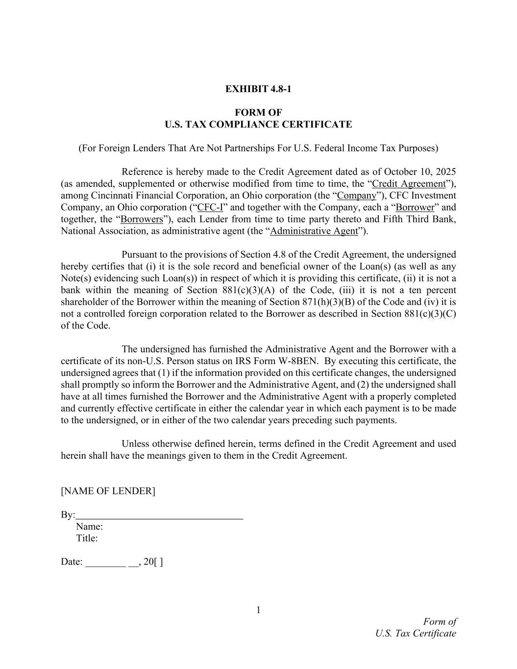 1 Form of U.S. Tax Certificate EXHIBIT 4.8-1 FORM OF U.S. TAX COMPLIANCE CERTIFICATE (For Foreign Lenders That Are Not Partnerships For U.S. Federal Income Tax Purposes) Reference is hereby made to the Credit Agreement dated as of October 10, 2025 (as amended, supplemented or otherwise modified from time to time, the “Credit Agreement”), among Cincinnati Financial Corporation, an Ohio corporation (the “Company”), CFC Investment Company, an Ohio corporation (“CFC-I” and together with the Company, each a “Borrower” and together, the “Borrowers”), each Lender from time to time party thereto and Fifth Third Bank, National Association, as administrative agent (the “Administrative Agent”). Pursuant to the provisions of Section 4.8 of the Credit Agreement, the undersigned hereby certifies that (i) it is the sole record and beneficial owner of the Loan(s) (as well as any Note(s) evidencing such Loan(s)) in respect of which it is providing this certificate, (ii) it is not a bank within the meaning of Section 881(c)(3)(A) of the Code, (iii) it is not a ten percent shareholder of the Borrower within the meaning of Section 871(h)(3)(B) of the Code and (iv) it is not a controlled foreign corporation related to the Borrower as described in Section 881(c)(3)(C) of the Code. The undersigned has furnished the Administrative Agent and the Borrower with a certificate of its non-U.S. Person status on IRS Form W-8BEN. By executing this certificate, the undersigned agrees that (1) if the information provided on this certificate changes, the undersigned shall promptly so inform the Borrower and the Administrative Agent, and (2) the undersigned shall have at all times furnished the Borrower and the Administrative Agent with a properly completed and currently effective certificate in either the calendar year in which each payment is to be made to the undersigned, or in either of the two calendar years preceding such payments. Unless otherwise defined herein, terms defined in the Credit Agreement and used herein shall have the meanings given to them in the Credit Agreement. [NAME OF LENDER] By: Name: Title: Date: ________ __, 20[ ]