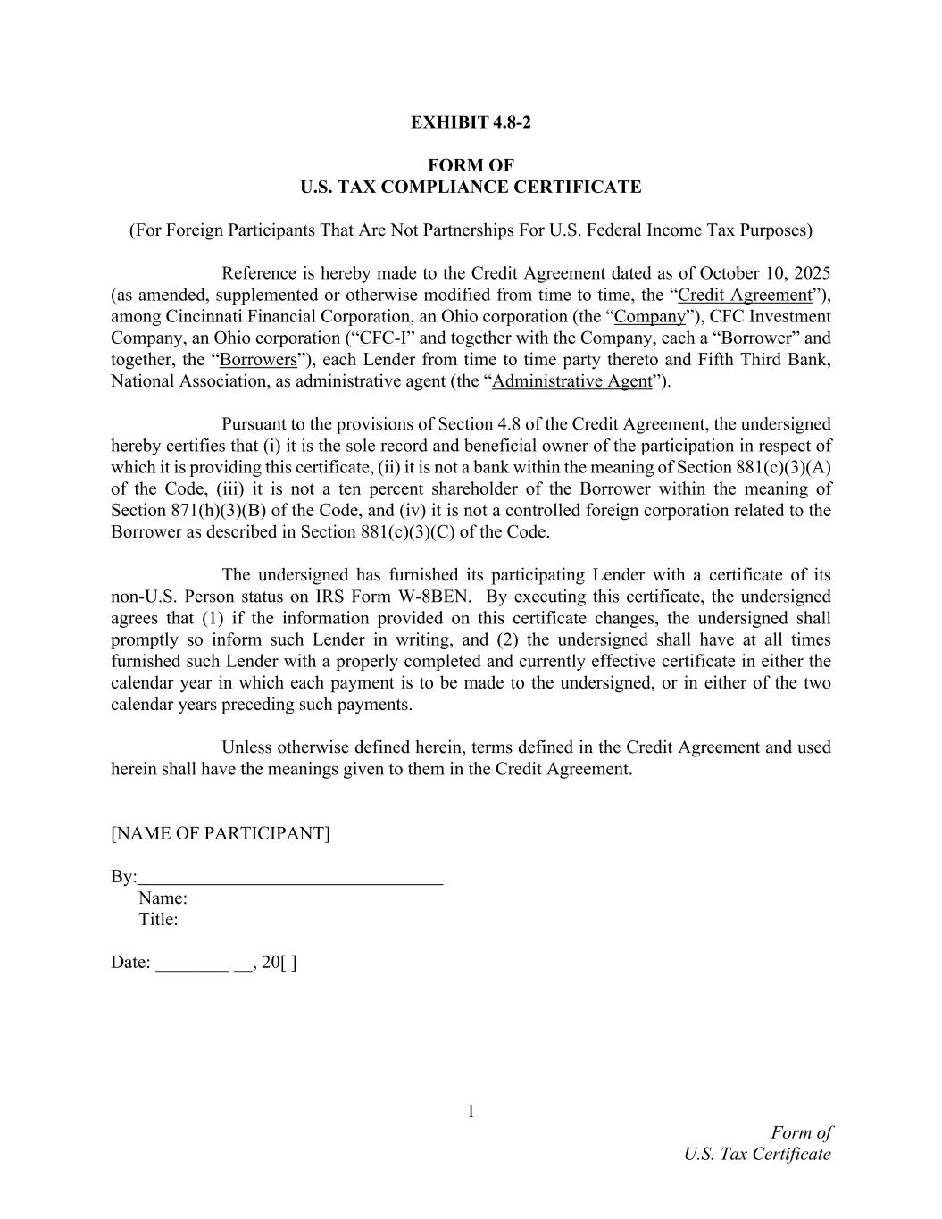 1 Form of U.S. Tax Certificate EXHIBIT 4.8-2 FORM OF U.S. TAX COMPLIANCE CERTIFICATE (For Foreign Participants That Are Not Partnerships For U.S. Federal Income Tax Purposes) Reference is hereby made to the Credit Agreement dated as of October 10, 2025 (as amended, supplemented or otherwise modified from time to time, the “Credit Agreement”), among Cincinnati Financial Corporation, an Ohio corporation (the “Company”), CFC Investment Company, an Ohio corporation (“CFC-I” and together with the Company, each a “Borrower” and together, the “Borrowers”), each Lender from time to time party thereto and Fifth Third Bank, National Association, as administrative agent (the “Administrative Agent”). Pursuant to the provisions of Section 4.8 of the Credit Agreement, the undersigned hereby certifies that (i) it is the sole record and beneficial owner of the participation in respect of which it is providing this certificate, (ii) it is not a bank within the meaning of Section 881(c)(3)(A) of the Code, (iii) it is not a ten percent shareholder of the Borrower within the meaning of Section 871(h)(3)(B) of the Code, and (iv) it is not a controlled foreign corporation related to the Borrower as described in Section 881(c)(3)(C) of the Code. The undersigned has furnished its participating Lender with a certificate of its non-U.S. Person status on IRS Form W-8BEN. By executing this certificate, the undersigned agrees that (1) if the information provided on this certificate changes, the undersigned shall promptly so inform such Lender in writing, and (2) the undersigned shall have at all times furnished such Lender with a properly completed and currently effective certificate in either the calendar year in which each payment is to be made to the undersigned, or in either of the two calendar years preceding such payments. Unless otherwise defined herein, terms defined in the Credit Agreement and used herein shall have the meanings given to them in the Credit Agreement. [NAME OF PARTICIPANT] By: Name: Title: Date: ________ __, 20[ ]
