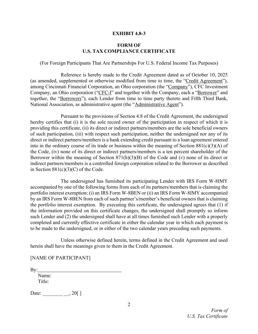 2 Form of U.S. Tax Certificate EXHIBIT 4.8-3 FORM OF U.S. TAX COMPLIANCE CERTIFICATE (For Foreign Participants That Are Partnerships For U.S. Federal Income Tax Purposes) Reference is hereby made to the Credit Agreement dated as of October 10, 2025 (as amended, supplemented or otherwise modified from time to time, the “Credit Agreement”), among Cincinnati Financial Corporation, an Ohio corporation (the “Company”), CFC Investment Company, an Ohio corporation (“CFC-I” and together with the Company, each a “Borrower” and together, the “Borrowers”), each Lender from time to time party thereto and Fifth Third Bank, National Association, as administrative agent (the “Administrative Agent”). Pursuant to the provisions of Section 4.8 of the Credit Agreement, the undersigned hereby certifies that (i) it is the sole record owner of the participation in respect of which it is providing this certificate, (ii) its direct or indirect partners/members are the sole beneficial owners of such participation, (iii) with respect such participation, neither the undersigned nor any of its direct or indirect partners/members is a bank extending credit pursuant to a loan agreement entered into in the ordinary course of its trade or business within the meaning of Section 881(c)(3)(A) of the Code, (iv) none of its direct or indirect partners/members is a ten percent shareholder of the Borrower within the meaning of Section 871(h)(3)(B) of the Code and (v) none of its direct or indirect partners/members is a controlled foreign corporation related to the Borrower as described in Section 881(c)(3)(C) of the Code. The undersigned has furnished its participating Lender with IRS Form W-8IMY accompanied by one of the following forms from each of its partners/members that is claiming the portfolio interest exemption: (i) an IRS Form W-8BEN or (ii) an IRS Form W-8IMY accompanied by an IRS Form W-8BEN from each of such partner’s/member’s beneficial owners that is claiming the portfolio interest exemption. By executing this certificate, the undersigned agrees that (1) if the information provided on this certificate changes, the undersigned shall promptly so inform such Lender and (2) the undersigned shall have at all times furnished such Lender with a properly completed and currently effective certificate in either the calendar year in which each payment is to be made to the undersigned, or in either of the two calendar years preceding such payments. Unless otherwise defined herein, terms defined in the Credit Agreement and used herein shall have the meanings given to them in the Credit Agreement. [NAME OF PARTICIPANT] By: Name: Title: Date: ________ __, 20[ ]