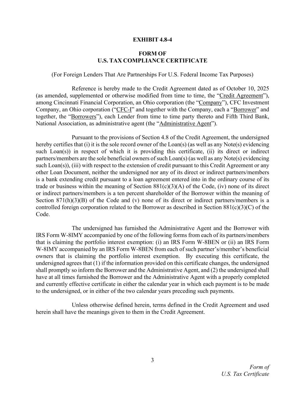 3 Form of U.S. Tax Certificate EXHIBIT 4.8-4 FORM OF U.S. TAX COMPLIANCE CERTIFICATE (For Foreign Lenders That Are Partnerships For U.S. Federal Income Tax Purposes) Reference is hereby made to the Credit Agreement dated as of October 10, 2025 (as amended, supplemented or otherwise modified from time to time, the “Credit Agreement”), among Cincinnati Financial Corporation, an Ohio corporation (the “Company”), CFC Investment Company, an Ohio corporation (“CFC-I” and together with the Company, each a “Borrower” and together, the “Borrowers”), each Lender from time to time party thereto and Fifth Third Bank, National Association, as administrative agent (the “Administrative Agent”). Pursuant to the provisions of Section 4.8 of the Credit Agreement, the undersigned hereby certifies that (i) it is the sole record owner of the Loan(s) (as well as any Note(s) evidencing such Loan(s)) in respect of which it is providing this certificate, (ii) its direct or indirect partners/members are the sole beneficial owners of such Loan(s) (as well as any Note(s) evidencing such Loan(s)), (iii) with respect to the extension of credit pursuant to this Credit Agreement or any other Loan Document, neither the undersigned nor any of its direct or indirect partners/members is a bank extending credit pursuant to a loan agreement entered into in the ordinary course of its trade or business within the meaning of Section 881(c)(3)(A) of the Code, (iv) none of its direct or indirect partners/members is a ten percent shareholder of the Borrower within the meaning of Section 871(h)(3)(B) of the Code and (v) none of its direct or indirect partners/members is a controlled foreign corporation related to the Borrower as described in Section 881(c)(3)(C) of the Code. The undersigned has furnished the Administrative Agent and the Borrower with IRS Form W-8IMY accompanied by one of the following forms from each of its partners/members that is claiming the portfolio interest exemption: (i) an IRS Form W-8BEN or (ii) an IRS Form W-8IMY accompanied by an IRS Form W-8BEN from each of such partner’s/member’s beneficial owners that is claiming the portfolio interest exemption. By executing this certificate, the undersigned agrees that (1) if the information provided on this certificate changes, the undersigned shall promptly so inform the Borrower and the Administrative Agent, and (2) the undersigned shall have at all times furnished the Borrower and the Administrative Agent with a properly completed and currently effective certificate in either the calendar year in which each payment is to be made to the undersigned, or in either of the two calendar years preceding such payments. Unless otherwise defined herein, terms defined in the Credit Agreement and used herein shall have the meanings given to them in the Credit Agreement.