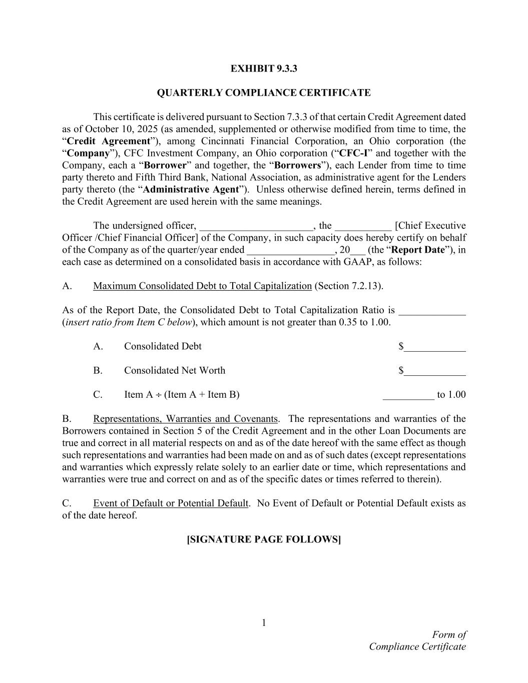 1 Form of Compliance Certificate EXHIBIT 9.3.3 QUARTERLY COMPLIANCE CERTIFICATE This certificate is delivered pursuant to Section 7.3.3 of that certain Credit Agreement dated as of October 10, 2025 (as amended, supplemented or otherwise modified from time to time, the “Credit Agreement”), among Cincinnati Financial Corporation, an Ohio corporation (the “Company”), CFC Investment Company, an Ohio corporation (“CFC-I” and together with the Company, each a “Borrower” and together, the “Borrowers”), each Lender from time to time party thereto and Fifth Third Bank, National Association, as administrative agent for the Lenders party thereto (the “Administrative Agent”). Unless otherwise defined herein, terms defined in the Credit Agreement are used herein with the same meanings. The undersigned officer, ______________________, the ___________ [Chief Executive Officer /Chief Financial Officer] of the Company, in such capacity does hereby certify on behalf of the Company as of the quarter/year ended _________________, 20___ (the “Report Date”), in each case as determined on a consolidated basis in accordance with GAAP, as follows: A. Maximum Consolidated Debt to Total Capitalization (Section 7.2.13). As of the Report Date, the Consolidated Debt to Total Capitalization Ratio is _____________ (insert ratio from Item C below), which amount is not greater than 0.35 to 1.00. A. Consolidated Debt $____________ B. Consolidated Net Worth $____________ C. Item A ÷ (Item A + Item B) __________ to 1.00 B. Representations, Warranties and Covenants. The representations and warranties of the Borrowers contained in Section 5 of the Credit Agreement and in the other Loan Documents are true and correct in all material respects on and as of the date hereof with the same effect as though such representations and warranties had been made on and as of such dates (except representations and warranties which expressly relate solely to an earlier date or time, which representations and warranties were true and correct on and as of the specific dates or times referred to therein). C. Event of Default or Potential Default. No Event of Default or Potential Default exists as of the date hereof. [SIGNATURE PAGE FOLLOWS]