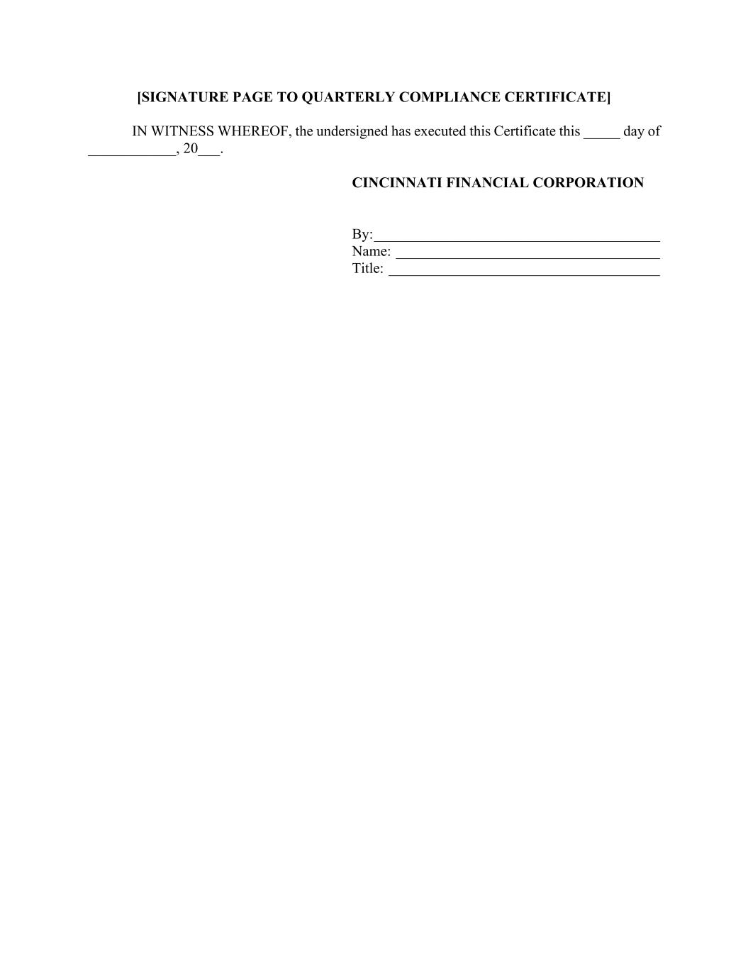 [SIGNATURE PAGE TO QUARTERLY COMPLIANCE CERTIFICATE] IN WITNESS WHEREOF, the undersigned has executed this Certificate this _____ day of ____________, 20___. CINCINNATI FINANCIAL CORPORATION By: _______________________________________ Name: ____________________________________ Title: _____________________________________