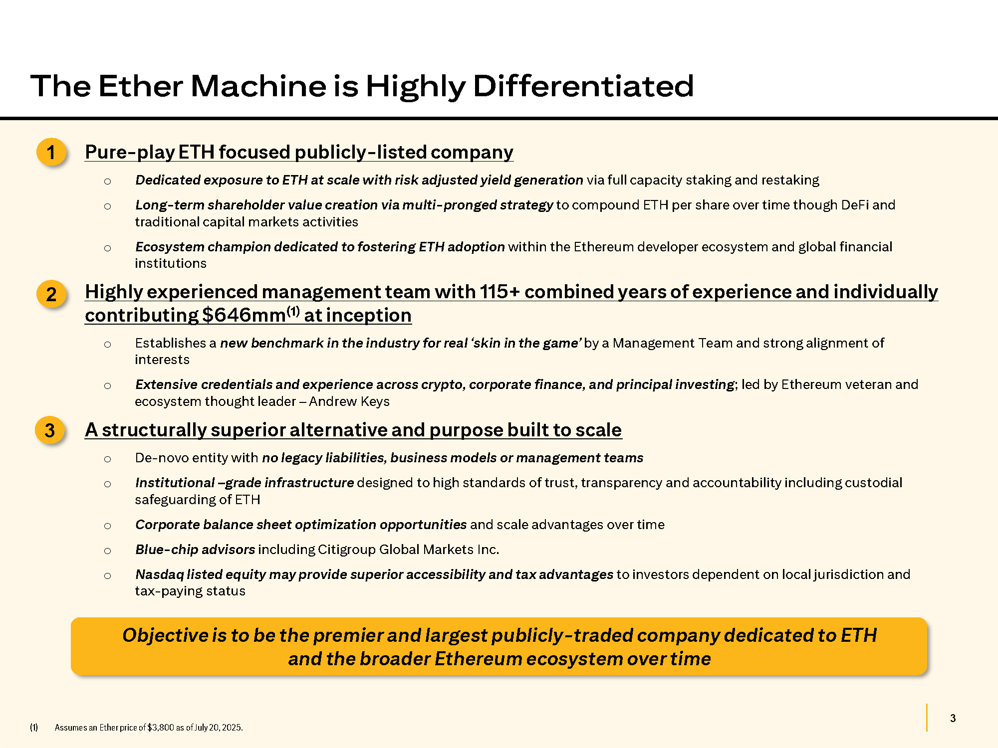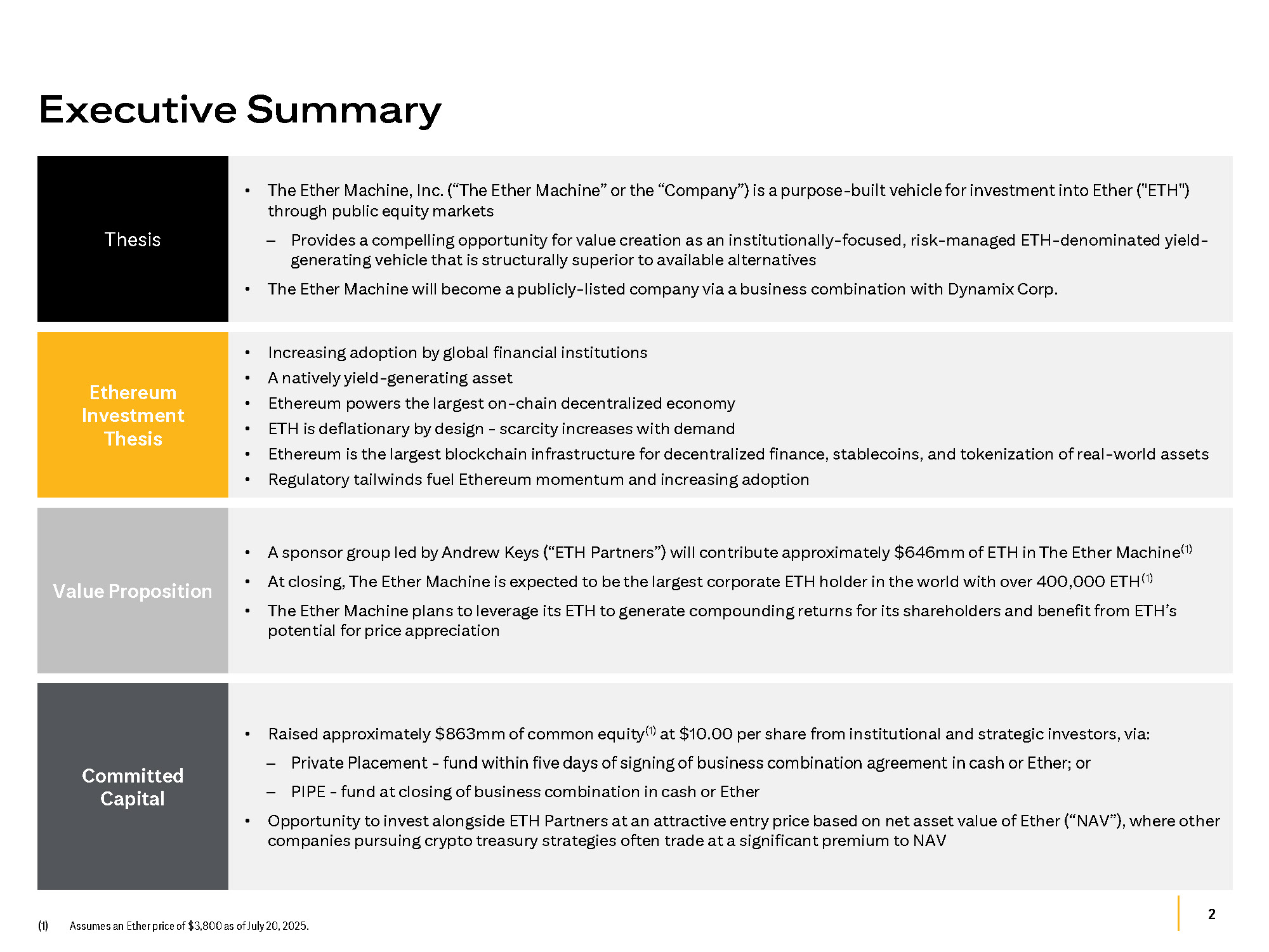 2 (1) Assumes an Ether price of $3,800 as of July 20, 2025. Executive Summary • The Ether Machine, Inc. (“The Ether Machine” or the “Company”) is a purpose - built vehicle for investment into Ether ("ETH") through public equity markets ‒ Provides a compelling opportunity for value creation as an institutionally - focused, risk - managed ETH - denominated yield - generating vehicle that is structurally superior to available alternatives • The Ether Machine will become a publicly - listed company via a business combination with Dynamix Corp. Thesis • Increasing adoption by global financial institutions • A natively yield - generating asset • Ethereum powers the largest on - chain decentralized economy • ETH is deflationary by design - scarcity increases with demand • Ethereum is the largest blockchain infrastructure for decentralized finance, stablecoins, and tokenization of real - world assets • Regulatory tailwinds fuel Ethereum momentum and increasing adoption Ethereum Investment Thesis • A sponsor group led by Andrew Keys (“ETH Partners”) will contribute approximately $646mm of ETH in The Ether Machine (1) • At closing, The Ether Machine is expected to be the largest corporate ETH holder in the world with over 400,000 ETH (1) • The Ether Machine plans to leverage its ETH to generate compounding returns for its shareholders and benefit from ETH’s potential for price appreciation Value Proposition • Raised approximately $863mm of common equity (1) at $10.00 per share from institutional and strategic investors, via: ‒ Private Placement - fund within five days of signing of business combination agreement in cash or Ether; or ‒ PIPE - fund at closing of business combination in cash or Ether • Opportunity to invest alongside ETH Partners at an attractive entry price based on net asset value of Ether (“NAV”), where other companies pursuing crypto treasury strategies often trade at a significant premium to NAV Committed Capital