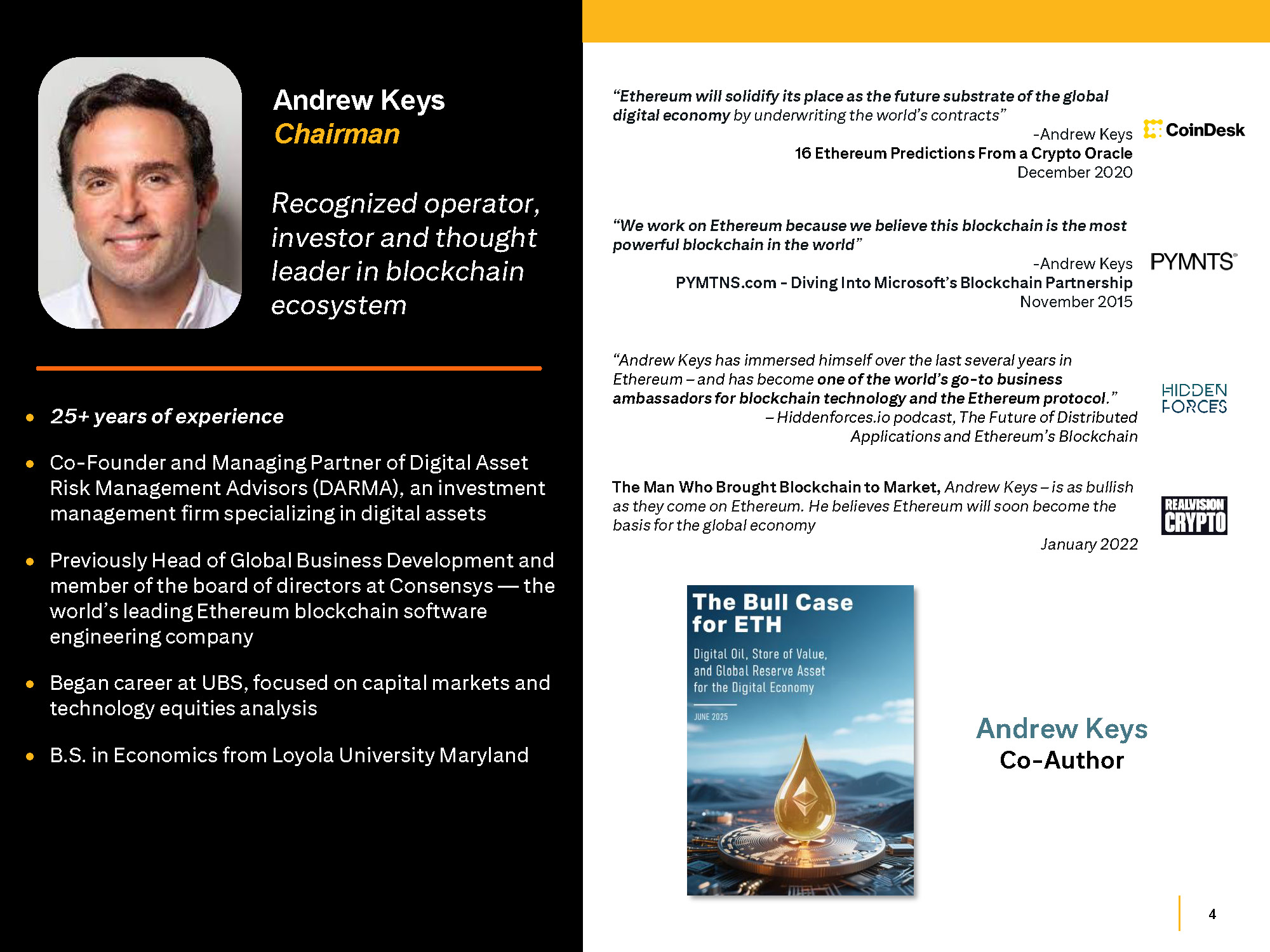 4 25+ years of experience Co - Founder and Managing Partner of Digital Asset Risk Management Advisors (DARMA), an investment management firm specializing in digital assets Previously Head of Global Business Development and member of the board of directors at Consensys — the world’s leading Ethereum blockchain software engineering company Began career at UBS, focused on capital markets and technology equities analysis B.S. in Economics from Loyola University Maryland Andrew Keys Chairman Recognized operator, investor and thought leader in blockchain ecosystem “Ethereum will solidify its place as the future substrate of the global digital economy by underwriting the world’s contracts” - Andrew Keys 16 Ethereum Predictions From a Crypto Oracle December 2020 “We work on Ethereum because we believe this blockchain is the most powerful blockchain in the world ” - Andrew Keys PYMTNS.com - Diving Into Microsoft’s Blockchain Partnership November 2015 “Andrew Keys has immersed himself over the last several years in Ethereum – and has become one of the world’s go - to business ambassadors for blockchain technology and the Ethereum protocol .” – Hiddenforces.io podcast, The Future of Distributed Applications and Ethereum’s Blockchain The Man Who Brought Blockchain to Market, Andrew Keys – is as bullish as they come on Ethereum. He believes Ethereum will soon become the basis for the global economy January 2022 Andrew Keys Co - Author