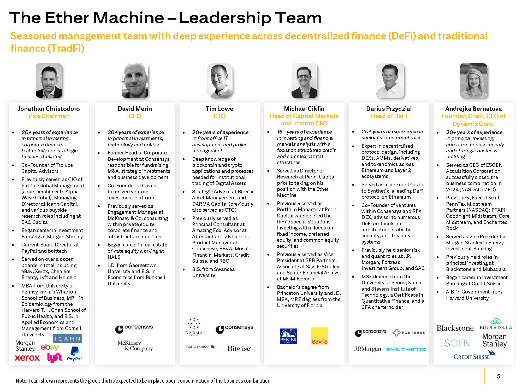 5 Note: Team shown represents the group that is expected to be in place upon consummation of the business combination. The Ether Machine – Leadership Team Seasoned management team with deep experience across decentralized finance (DeFi) and traditional finance (TradFi) Michael Ciklin Head of Capital Markets and Interim CFO 16+ years of experience in investing and financial markets analysis with a focus on structured credit and complex capital structures Served as Director of Research at Perini Capital prior to taking on his position with the Ether Machine Previously served as Portfolio Manager at Perini Capital where he led the firm’s special situations investing with a focus on fixed income, preferred equity, and common equity securities Previously served as Vice President at SPB Partners, Associate at Savills Studley, and Senior Financial Analyst at MGM Resorts Bachelor’s degree from Princeton University and JD, MBA, MRE degrees from the University of Florida Jonathan Christodoro Vice Chairman 20+ years of experience in principal investing, corporate finance, technology and strategic business building Co - Founder of Troluce Capital Advisors Previously served as CIO of Patriot Global Management, (a partnership with Alpha Wave Global), Managing Director at Icahn Capital, and various buyside research roles including at SAC Capital Began career in Investment Banking at Morgan Stanley Current Board Director at PayPal and bolttech Served on over a dozen boards in total including eBay, Xerox, Cheniere Energy, Lyft and Hologic MBA from University of Pennsylvania's Wharton School of Business, MPH in Epidemiology from the Harvard T.H. Chan School of Public Health, and B.S. in Applied Economics and Management from Cornell University David Merin CEO 20 + years of experience in principal investments, technology and politics Former Head of Corporate Development at Consensys, responsible for fundraising, M&A, strategic investments and business development Co - Founder of Coven, tokenized venture investment platform Previously served as Engagement Manager at McKinsey & Co, consulting within private equity, corporate finance and infrastructure practices Began career in real estate private equity working at NALS J.D. from Georgetown University and B.S. in Economics from Bucknell University Andrejka Bernatova Founder, Chair, CEO of Dynamix Corp . 20+ years of experience in principal investing, corporate finance, energy and strategic business building Served as CEO of ESGEN Acquisition Corporation; successfully closed the business combination in 2024 (NASDAQ: ZEO) Previously, Executive at PennTex Midstream Partners (NASDAQ: PTXP), Goodnight Midstream, Core Midstream, and Enchanted Rock Served as Vice President at Morgan Stanley in Energy Investment Banking Previously held roles in principal investing at Blackstone and Mubadala Began career in Investment Banking at Credit Suisse A.B. in Government from Harvard University Tim Lowe CTO 20+ years of experience in front office IT development and project management Deep knowledge of blockchain and crypto applications and processes needed for institutional trading of Digital Assets Strategic Advisor at Bitwise Asset Management and DARMA Capital (previously also served as CTO) Previously served as Principal Consultant at Amazing Fox, Advisor at Attestant and ZK Ladder, Product Manager at Consensys, BBVA, Mosaic Financial Markets, Credit Suisse, and RBC B.S. from Swansea University Darius Przydzial Head of DeFi 20+ years of experience in senior risk and quant roles Expert in decentralized protocol design, including DEXs, AMMs, derivatives, and tokenomics across Ethereum and Layer 2 ecosystems Served as a core contributor to Synthetix, a leading DeFi protocol on Ethereum Co - Founder of ventures within Consensys and RFX DEX; advisor to numerous DeFi protocols on architecture, stability, security, and treasury systems Previously held senior risk and quant roles at J.P. Morgan, Fortress Investment Group, and SAC MSE degrees from the University of Pennsylvania and Stevens Institute of Technology, a Certificate in Quantitative Finance, and a CFA charterholder