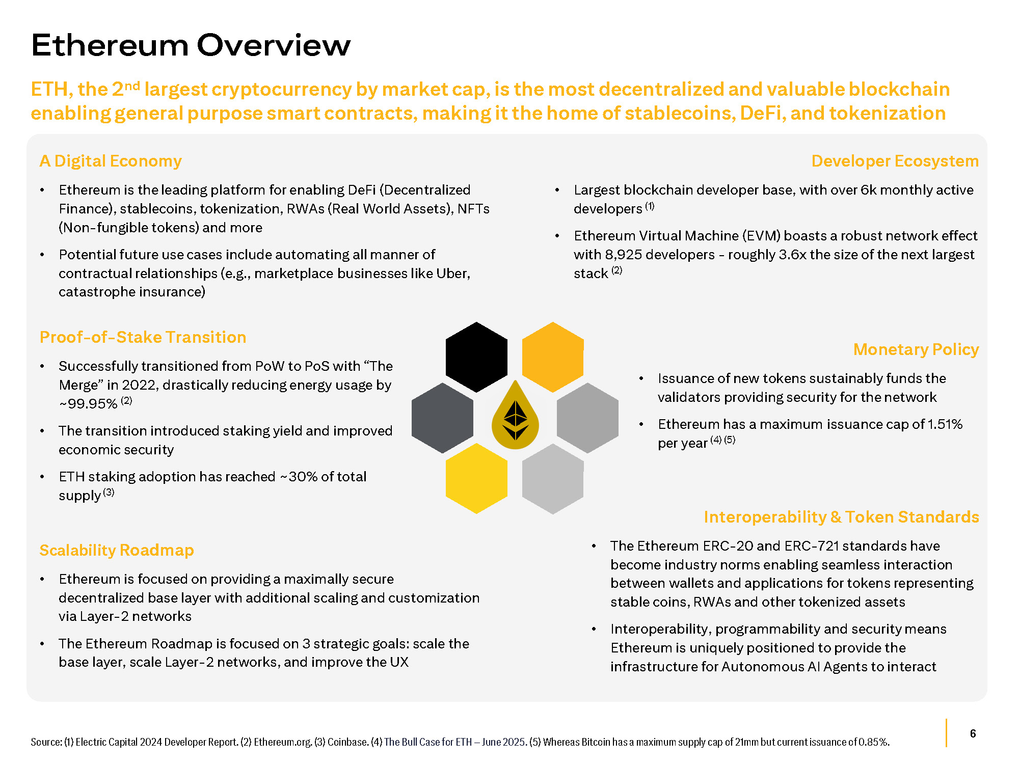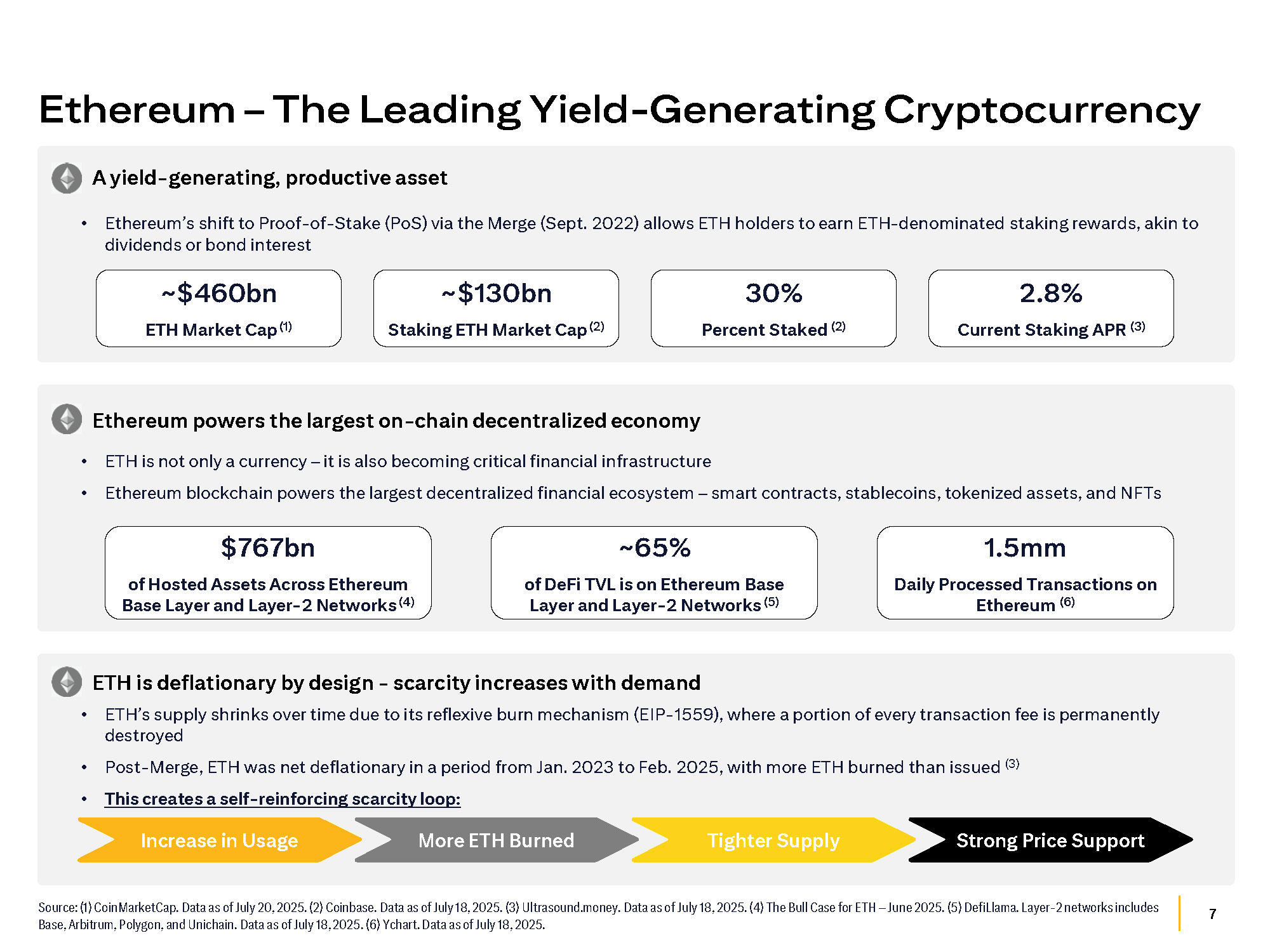 6 Source: (1) Electric Capital 2024 Developer Report. (2) Ethereum.org. (3) Coinbase. (4) The Bull Case for ETH – June 2025. (5) Whereas Bitcoin has a maximum supply cap of 21mm but current issuance of 0.85%. ETH, the 2 nd largest cryptocurrency by market cap, is the most decentralized and valuable blockchain enabling general purpose smart contracts, making it the home of stablecoins, DeFi, and tokenization Ethereum Overview Developer Ecosystem • Largest blockchain developer base, with over 6 k monthly active developers ( 1 ) • Ethereum Virtual Machine (EVM) boasts a robust network effect with 8 , 925 developers - roughly 3 . 6 x the size of the next largest stack ( 2 ) Scalability Roadmap • Ethereum is focused on providing a maximally secure decentralized base layer with additional scaling and customization via Layer - 2 networks • The Ethereum Roadmap is focused on 3 strategic goals: scale the base layer, scale Layer - 2 networks, and improve the UX Interoperability & Token Standards • The Ethereum ERC - 20 and ERC - 721 standards have become industry norms enabling seamless interaction between wallets and applications for tokens representing stable coins, RWAs and other tokenized assets • Interoperability, programmability and security means Ethereum is uniquely positioned to provide the infrastructure for Autonomous AI Agents to interact A Digital Economy • Ethereum is the leading platform for enabling DeFi (Decentralized Finance), stablecoins, tokenization, RWAs (Real World Assets), NFTs (Non - fungible tokens) and more • Potential future use cases include automating all manner of contractual relationships (e.g., marketplace businesses like Uber, catastrophe insurance) Proof - of - Stake Transition • Successfully transitioned from PoW to PoS with “The Merge” in 2022, drastically reducing energy usage by ~99.95% (2) • The transition introduced staking yield and improved economic security • ETH staking adoption has reached ~30% of total supply (3) Monetary Policy • Issuance of new tokens sustainably funds the validators providing security for the network • Ethereum has a maximum issuance cap of 1.51% per year (4) (5)