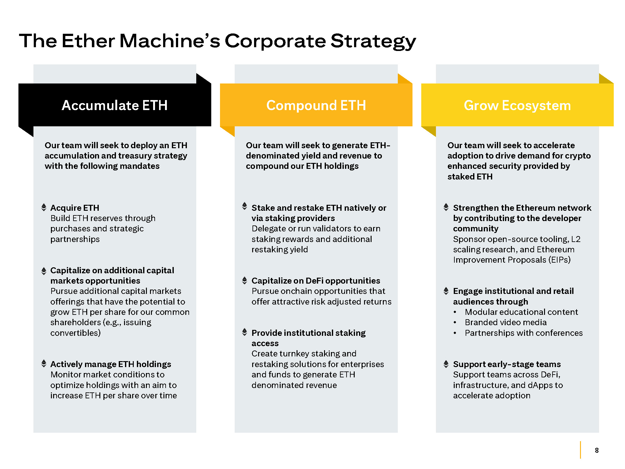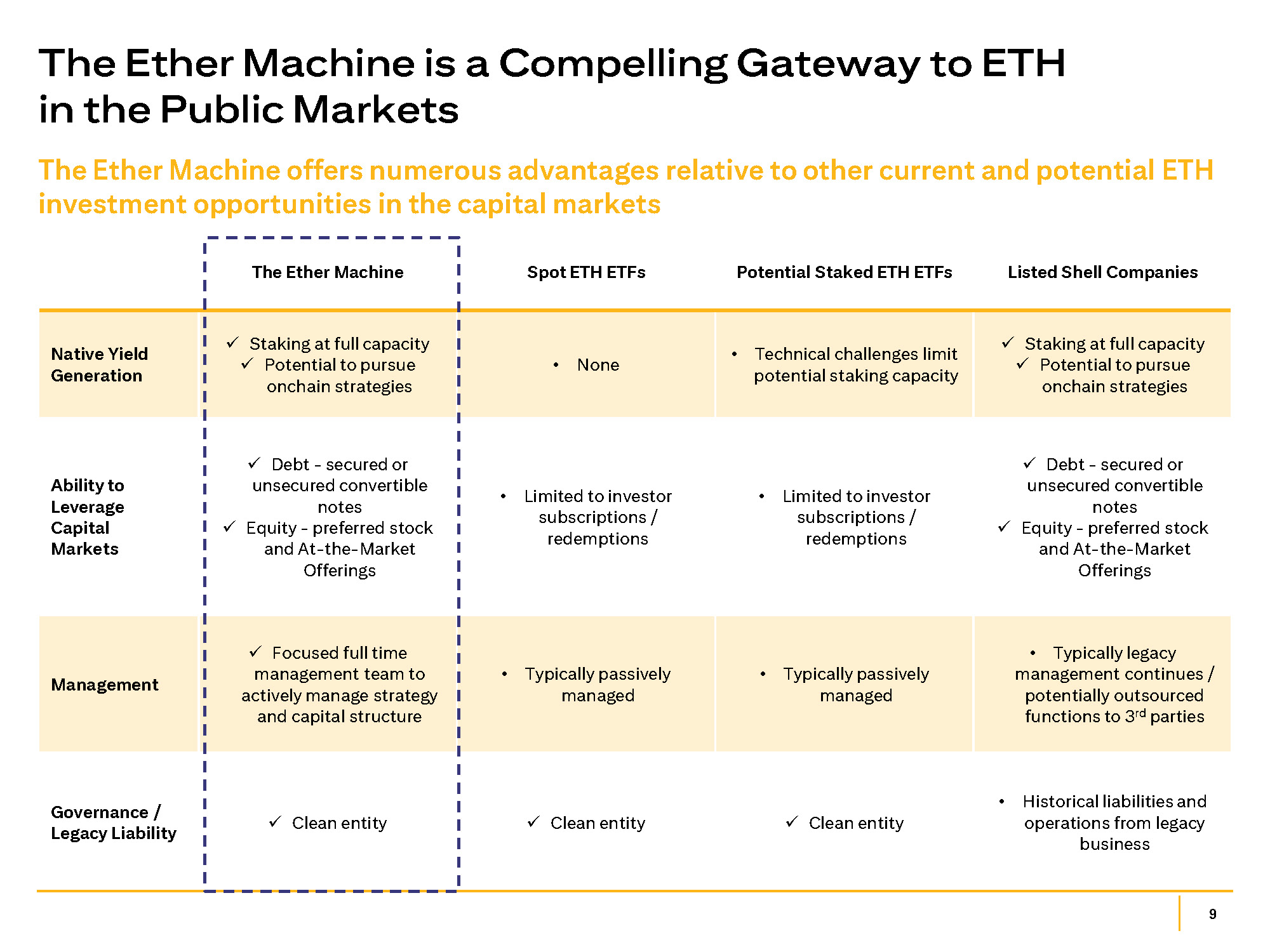 8 The Ether Machine’s Corporate Strategy Our team will seek to generate ETH - denominated yield and revenue to compound our ETH holdings Stake and restake ETH natively or via staking providers Delegate or run validators to earn staking rewards and additional restaking yield Capitalize on DeFi opportunities Pursue onchain opportunities that offer attractive risk adjusted returns Provide institutional staking access Create turnkey staking and restaking solutions for enterprises and funds to generate ETH denominated revenue Compound ETH Our team will seek to accelerate adoption to drive demand for crypto enhanced security provided by staked ETH Strengthen the Ethereum network by contributing to the developer community Sponsor open - source tooling, L2 scaling research, and Ethereum Improvement Proposals (EIPs) Engage institutional and retail audiences through • Modular educational content • Branded video media • Partnerships with conferences Support early - stage teams Support teams across DeFi, infrastructure, and dApps to accelerate adoption Grow Ecosystem Our team will seek to deploy an ETH accumulation and treasury strategy with the following mandates Acquire ETH Build ETH reserves through purchases and strategic partnerships Capitalize on additional capital markets opportunities Pursue additional capital markets offerings that have the potential to grow ETH per share for our common shareholders (e.g., issuing convertibles) Actively manage ETH holdings Monitor market conditions to optimize holdings with an aim to increase ETH per share over time Accumulate ETH