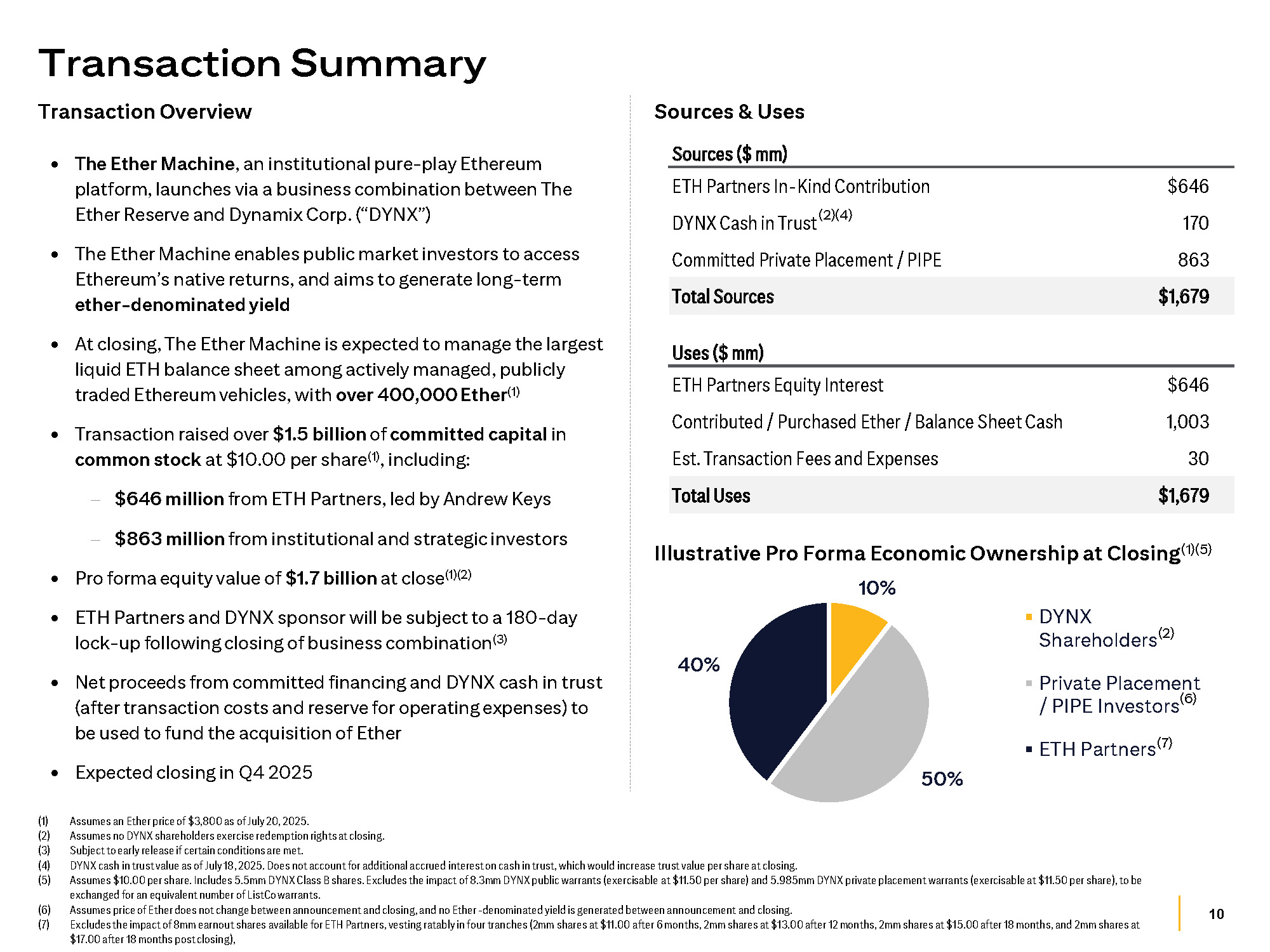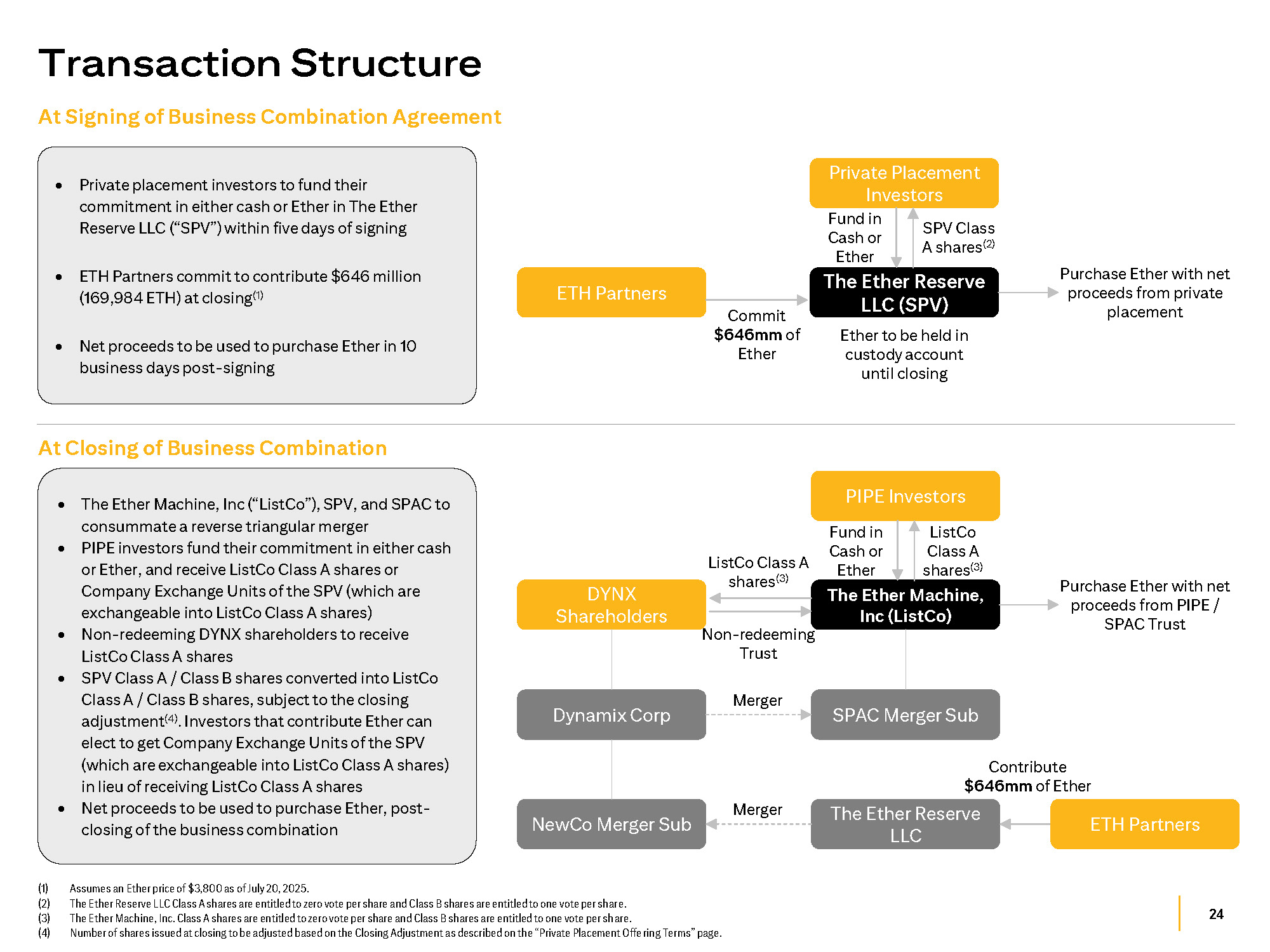 24 (1) Assumes an Ether price of $3,800 as of July 20, 2025. (2) The Ether Reserve LLC Class A shares are entitled to zero vote per share and Class B shares are entitled to one vote per share. (3) The Ether Machine, Inc. Class A shares are entitled to zero vote per share and Class B shares are entitled to one vote per share. (4) Number of shares issued at closing to be adjusted based on the Closing Adjustment as described on the “Private Placement Offering Terms” page. Transaction Structure At Closing of Business Combination The Ether Reserve LLC DYNX Shareholders PIPE Investors The Ether Machine, Inc (ListCo) Dynamix Corp SPAC Merger Sub NewCo Merger Sub The Ether Machine, Inc (“ListCo”), SPV, and SPAC to consummate a reverse triangular merger PIPE investors fund their commitment in either cash or Ether, and receive ListCo Class A shares or Company Exchange Units of the SPV (which are exchangeable into ListCo Class A shares) Non - redeeming DYNX shareholders to receive ListCo Class A shares SPV Class A / Class B shares converted into ListCo Class A / Class B shares, subject to the closing adjustment (4) . Investors that contribute Ether can elect to get Company Exchange Units of the SPV (which are exchangeable into ListCo Class A shares) in lieu of receiving ListCo Class A shares Net proceeds to be used to purchase Ether, post - closing of the business combination Merger Merger ListCo Class A shares ( 3 ) ListCo Class A shares (3) Fund in Cash or Ether Non - redeeming Trust At Signing of Business Combination Agreement Private placement investors to fund their commitment in either cash or Ether in The Ether Reserve LLC (“SPV”) within five days of signing ETH Partners commit to contribute $646 million (169,984 ETH) at closing (1) Net proceeds to be used to purchase Ether in 10 business days post - signing ETH Partners SPV Class A shares (2) Private Placement Investors Fund in Cash or Ether Purchase Ether with net proceeds from private placement Commit $646mm of Ether The Ether Reserve LLC (SPV) Ether to be held in custody account until closing Purchase Ether with net proceeds from PIPE / SPAC Trust Contribute $646mm of Ether ETH Partners