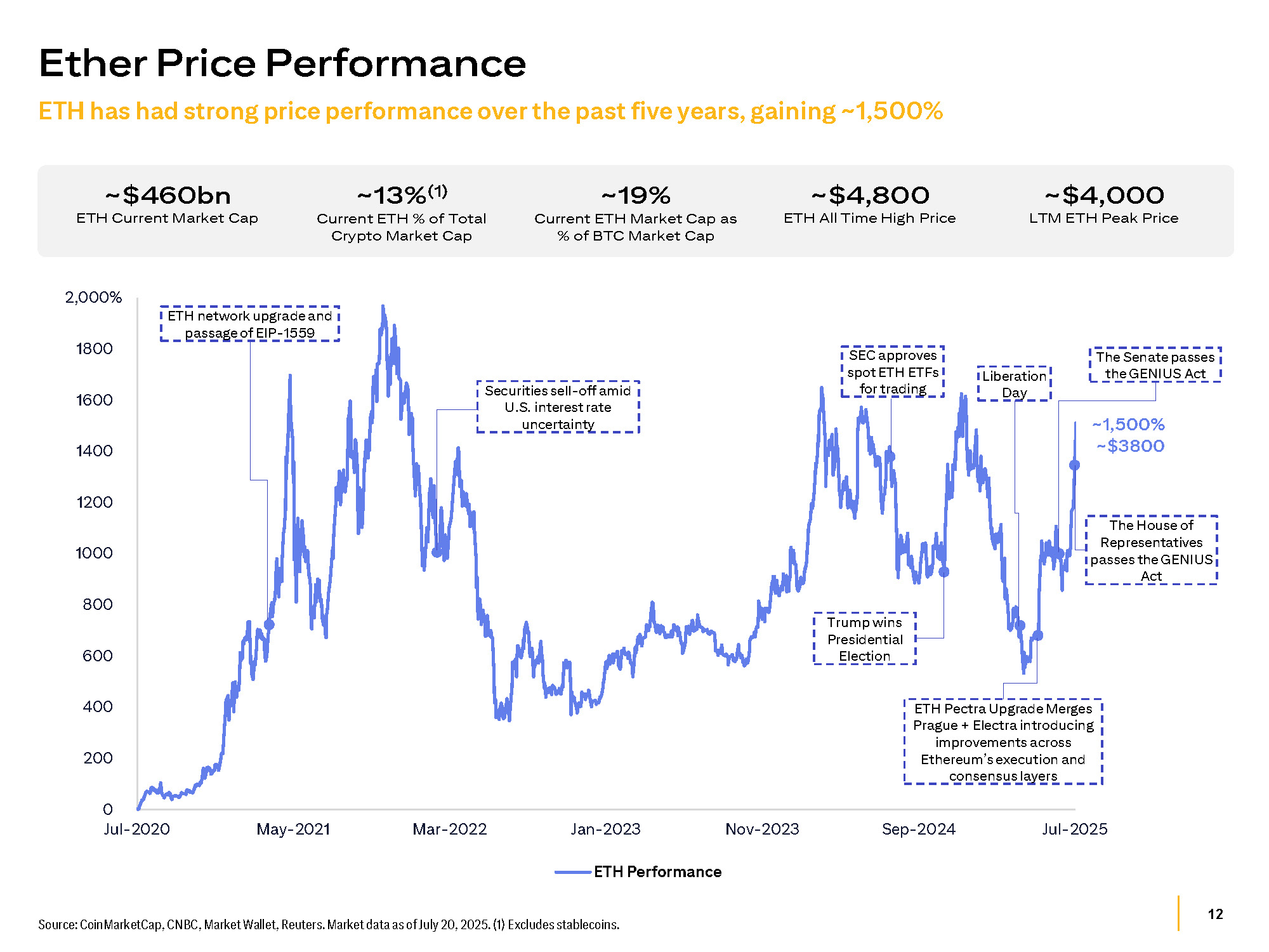 12 1,400% 0 200 400 600 800 1000 1200 1400 1600 1800 Jul - 2020 May - 2021 Mar - 2022 Jan - 2023 Nov - 2023 Sep - 2024 Jul - 2025 ETH Performance Source: CoinMarketCap, CNBC, Market Wallet, Reuters. Market data as of July 20, 2025. (1) Excludes stablecoins. Ether Price Performance ~$460bn ETH Current Market Cap ~$4,000 LTM ETH Peak Price ~$4,800 ETH All Time High Price ~13% (1) Current ETH % of Total Crypto Market Cap ETH has had strong price performance over the past five years, gaining ~1,500% The Senate passes the GENIUS Act 2,000% ETH network upgrade and passage of EIP - 1559 Securities sell - off amid U.S. interest rate uncertainty SEC approves spot ETH ETFs for trading Liberation Day ETH Pectra Upgrade Merges Prague + Electra introducing improvements across Ethereum’s execution and consensus layers Trump wins Presidential Election ~1,500% ~$3800 ~19% Current ETH Market Cap as % of BTC Market Cap The House of Representatives passes the GENIUS Act