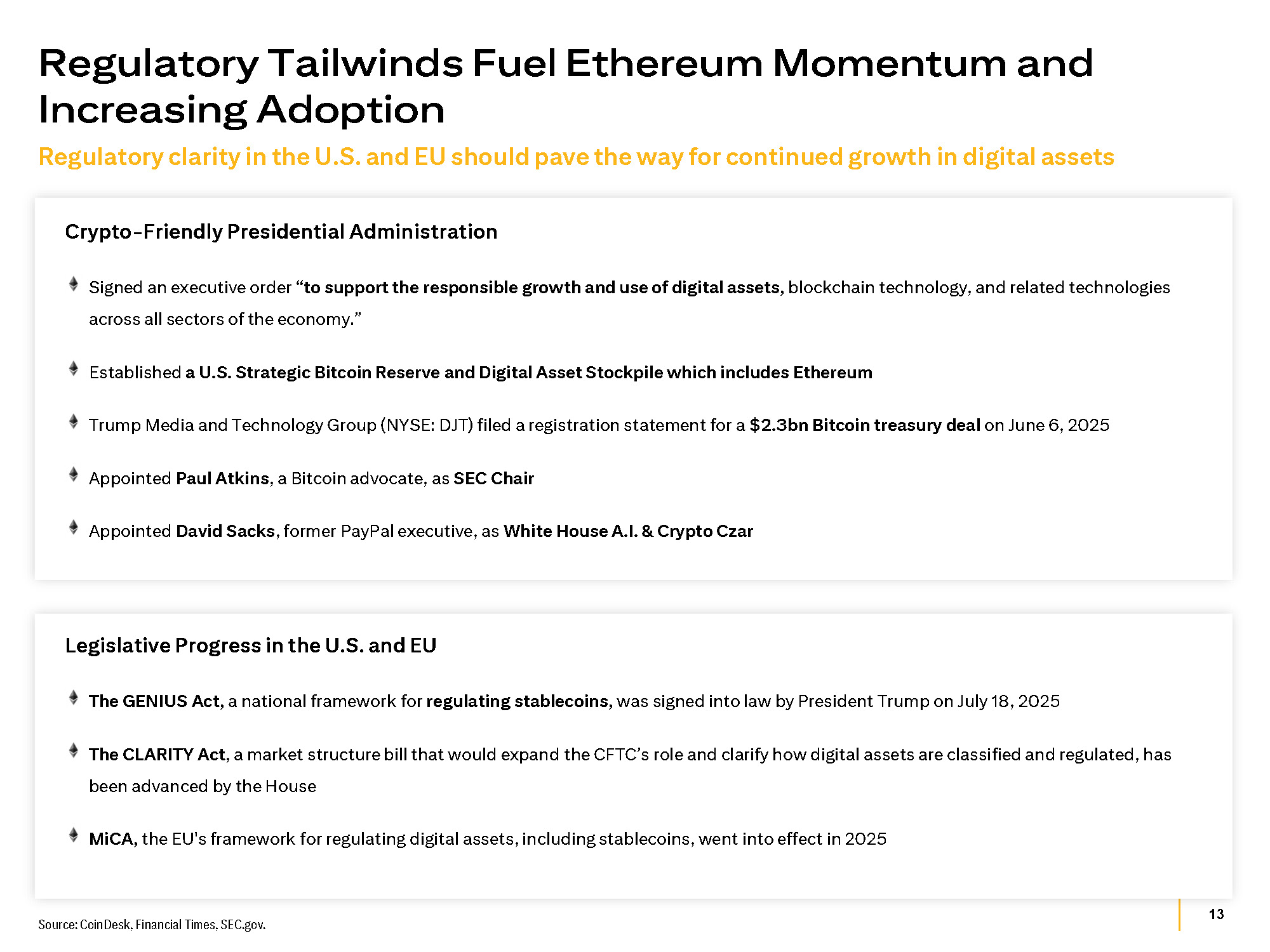 13 Crypto - Friendly Presidential Administration Signed an executive order “to support the responsible growth and use of digital assets, blockchain technology, and related technologies across all sectors of the economy.” Established a U.S. Strategic Bitcoin Reserve and Digital Asset Stockpile which includes Ethereum Trump Media and Technology Group (NYSE: DJT) filed a registration statement for a $2.3bn Bitcoin treasury deal on June 6, 2025 Appointed Paul Atkins , a Bitcoin advocate, as SEC Chair Appointed David Sacks , former PayPal executive, as White House A.I. & Crypto Czar Legislative Progress in the U.S. and EU The GENIUS Act, a national framework for regulating stablecoins, was signed into law by President Trump on July 18, 2025 The CLARITY Act , a market structure bill that would expand the CFTC’s role and clarify how digital assets are classified and regulated, has been advanced by the House MiCA, the EU's framework for regulating digital assets, including stablecoins, went into effect in 2025 Source: CoinDesk, Financial Times, SEC.gov. Regulatory clarity in the U.S. and EU should pave the way for continued growth in digital assets Regulatory Tailwinds Fuel Ethereum Momentum and Increasing Adoption