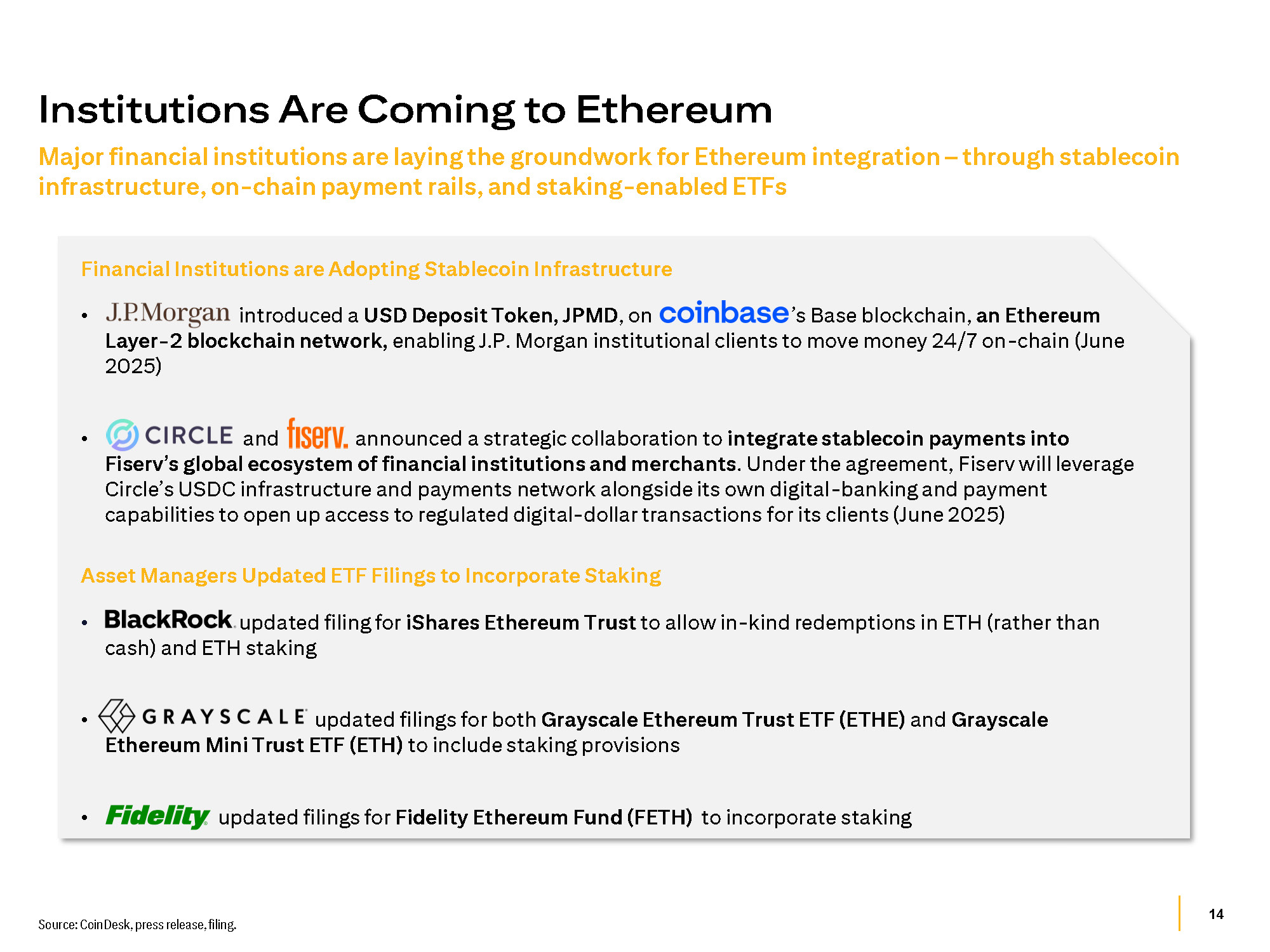 14 Source: CoinDesk, press release, filing. Major financial institutions are laying the groundwork for Ethereum integration – through stablecoin infrastructure, on - chain payment rails, and staking - enabled ETFs Financial Institutions are Adopting Stablecoin Infrastructure • introduced a USD Deposit Token, JPMD , on ’s Base blockchain, an Ethereum Layer - 2 blockchain network, enabling J.P. Morgan institutional clients to move money 24/7 on - chain (June 2025) Institutions Are Coming to Ethereum • and announced a strategic collaboration to integrate stablecoin payments into Fiserv’s global ecosystem of financial institutions and merchants . Under the agreement, Fiserv will leverage Circle’s USDC infrastructure and payments network alongside its own digital - banking and payment capabilities to open up access to regulated digital - dollar transactions for its clients (June 2025) Asset Managers Updated ETF Filings to Incorporate Staking • updated filing for iShares Ethereum Trust to allow in - kind redemptions in ETH (rather than cash) and ETH staking • updated filings for both Grayscale Ethereum Trust ETF (ETHE) and Grayscale Ethereum Mini Trust ETF (ETH) to include staking provisions • updated filings for Fidelity Ethereum Fund (FETH) to incorporate staking