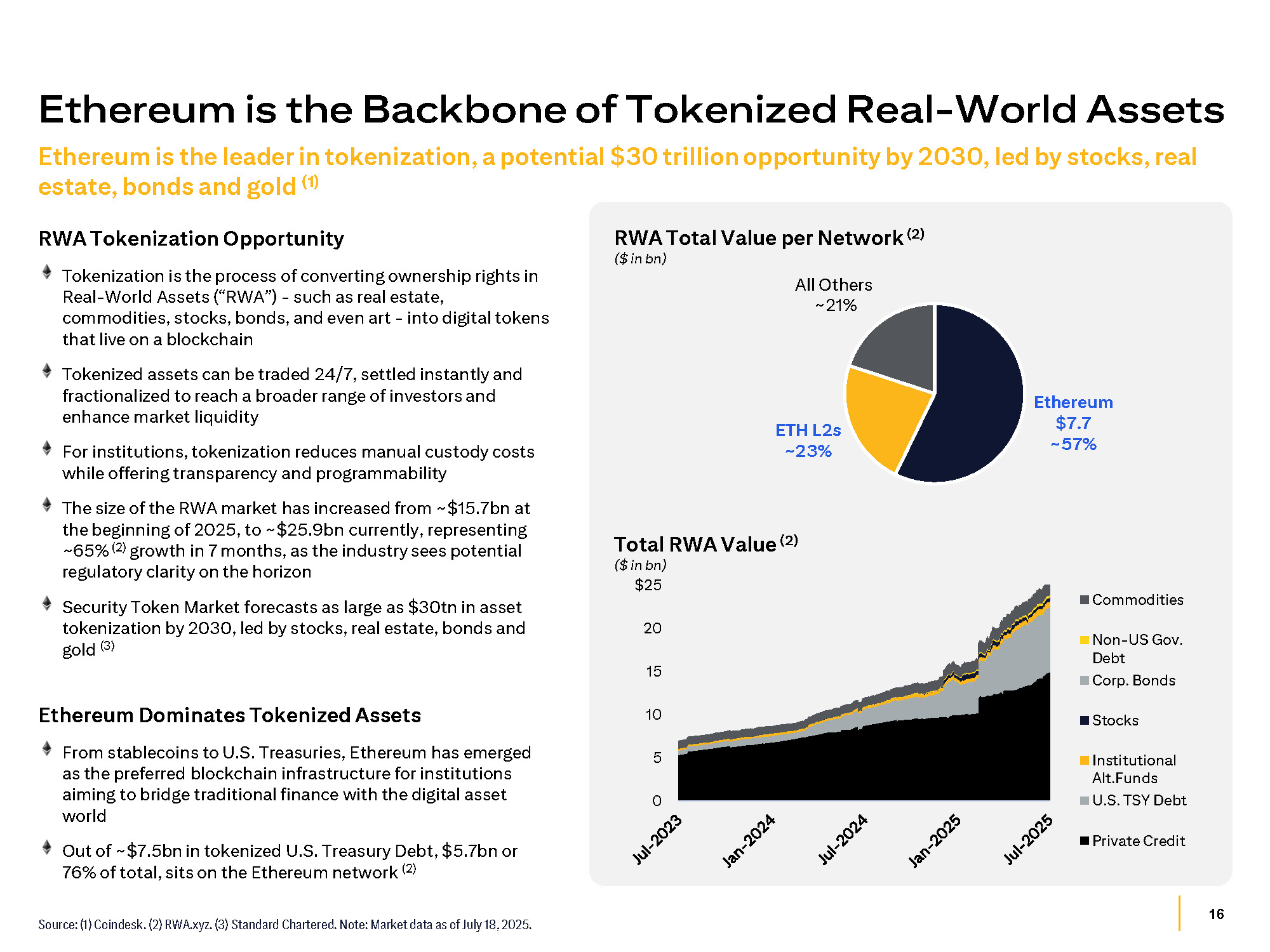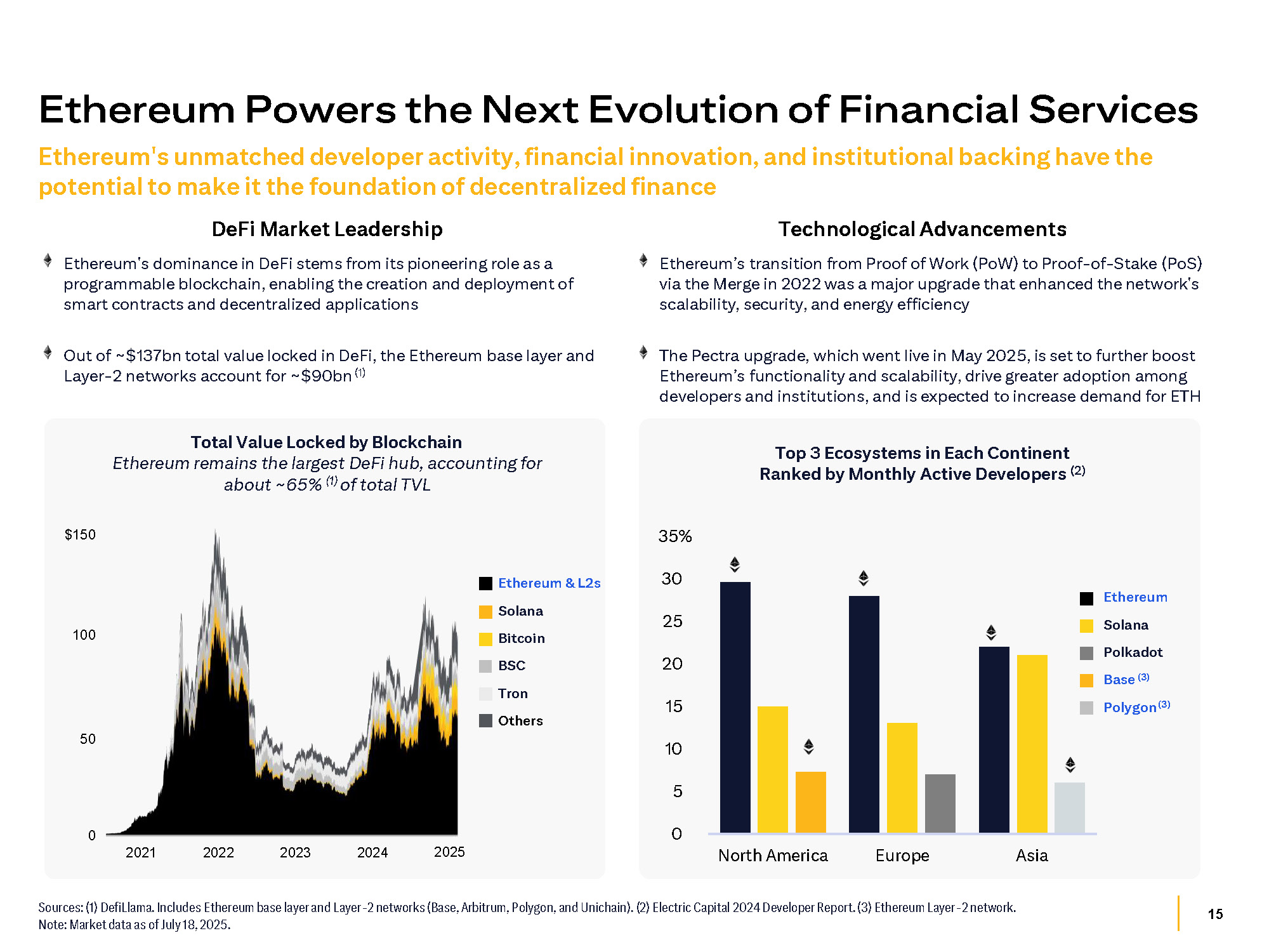 15 0 5 10 15 20 25 30 35% North America Europe Asia Sources: (1) DefiLlama. Includes Ethereum base layer and Layer - 2 networks (Base, Arbitrum, Polygon, and Unichain). (2) Electric Capital 2024 Developer Report. (3) Ethereum Layer - 2 network. Note: Market data as of July 18, 2025. Ethereum's unmatched developer activity, financial innovation, and institutional backing have the potential to make it the foundation of decentralized finance Ethereum Powers the Next Evolution of Financial Services Total Value Locked by Blockchain Ethereum remains the largest DeFi hub, accounting for about ~65% (1) of total TVL DeFi Market Leadership Ethereum's dominance in DeFi stems from its pioneering role as a programmable blockchain, enabling the creation and deployment of smart contracts and decentralized applications Technological Advancements Ethereum’s transition from Proof of Work (PoW) to Proof - of - Stake (PoS) via the Merge in 2022 was a major upgrade that enhanced the network's scalability, security, and energy efficiency Out of ~$137bn total value locked in DeFi, the Ethereum base layer and Layer - 2 networks account for ~$90bn (1) The Pectra upgrade, which went live in May 2025, is set to further boost Ethereum’s functionality and scalability, drive greater adoption among developers and institutions, and is expected to increase demand for ETH Top 3 Ecosystems in Each Continent Ranked by Monthly Active Developers (2) Ethereum Solana Polkadot Base (3) Polygon (3) Ethereum & L 2 s Solana Bitcoin BSC Tron Others $150 100 50 0 2021 2022 2023 2024 2025