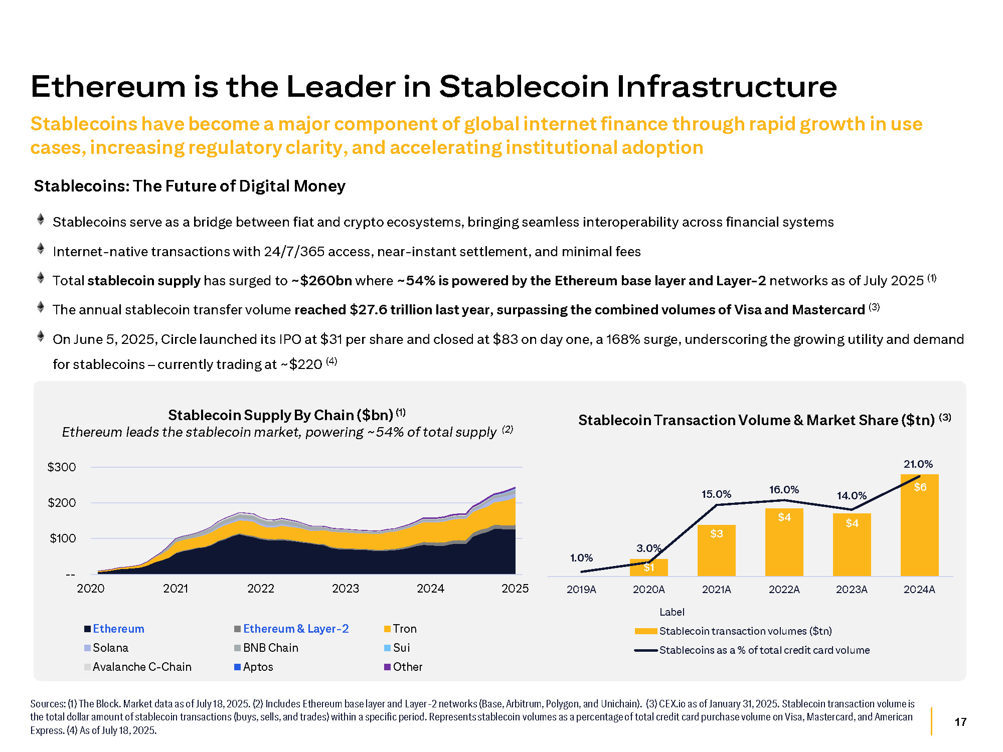 17 Sources : ( 1 ) The Block . Market data as of July 18 , 2025 . ( 2 ) Includes Ethereum base layer and Layer - 2 networks (Base, Arbitrum, Polygon, and Unichain) . ( 3 ) CEX . io as of January 31 , 2025 . Stablecoin transaction volume is the total dollar amount of stablecoin transactions (buys, sells, and trades) within a specific period . Represents stablecoin volumes as a percentage of total credit card purchase volume on Visa, Mastercard, and American Express . ( 4 ) As of July 18 , 2025 . Ethereum is the Leader in Stablecoin Infrastructure Stablecoins have become a major component of global internet finance through rapid growth in use cases, increasing regulatory clarity, and accelerating institutional adoption Stablecoins: The Future of Digital Money Stablecoins serve as a bridge between fiat and crypto ecosystems, bringing seamless interoperability across financial systems Internet - native transactions with 24/7/365 access, near - instant settlement, and minimal fees Total stablecoin supply has surged to ~$260bn where ~54% is powered by the Ethereum base layer and Layer - 2 networks as of July 2025 (1) The annual stablecoin transfer volume reached $27.6 trillion last year, surpassing the combined volumes of Visa and Mastercard (3) On June 5, 2025, Circle launched its IPO at $31 per share and closed at $83 on day one, a 168% surge, underscoring the growing utility and demand for stablecoins – currently trading at ~$220 (4) Stablecoin Transaction Volume & Market Share ($tn) (3) Stablecoin Supply By Chain ($bn) (1) Ethereum leads the stablecoin market, powering ~54% of total supply (2) - - $100 $200 $300 2024 2025 2020 2021 Ethereum Solana Avalanche C - Chain 2022 2023 Ethereum & Layer - 2 BNB Chain Aptos Tron Sui Other $1 $3 $4 $4 $6 3.0% 1.0% 15.0% 16.0% 14.0% 21.0% 2019A 2021A 2022A 2023A 2024A 2020A Label Stablecoin transaction volumes ($tn) Stablecoins as a % of total credit card volume