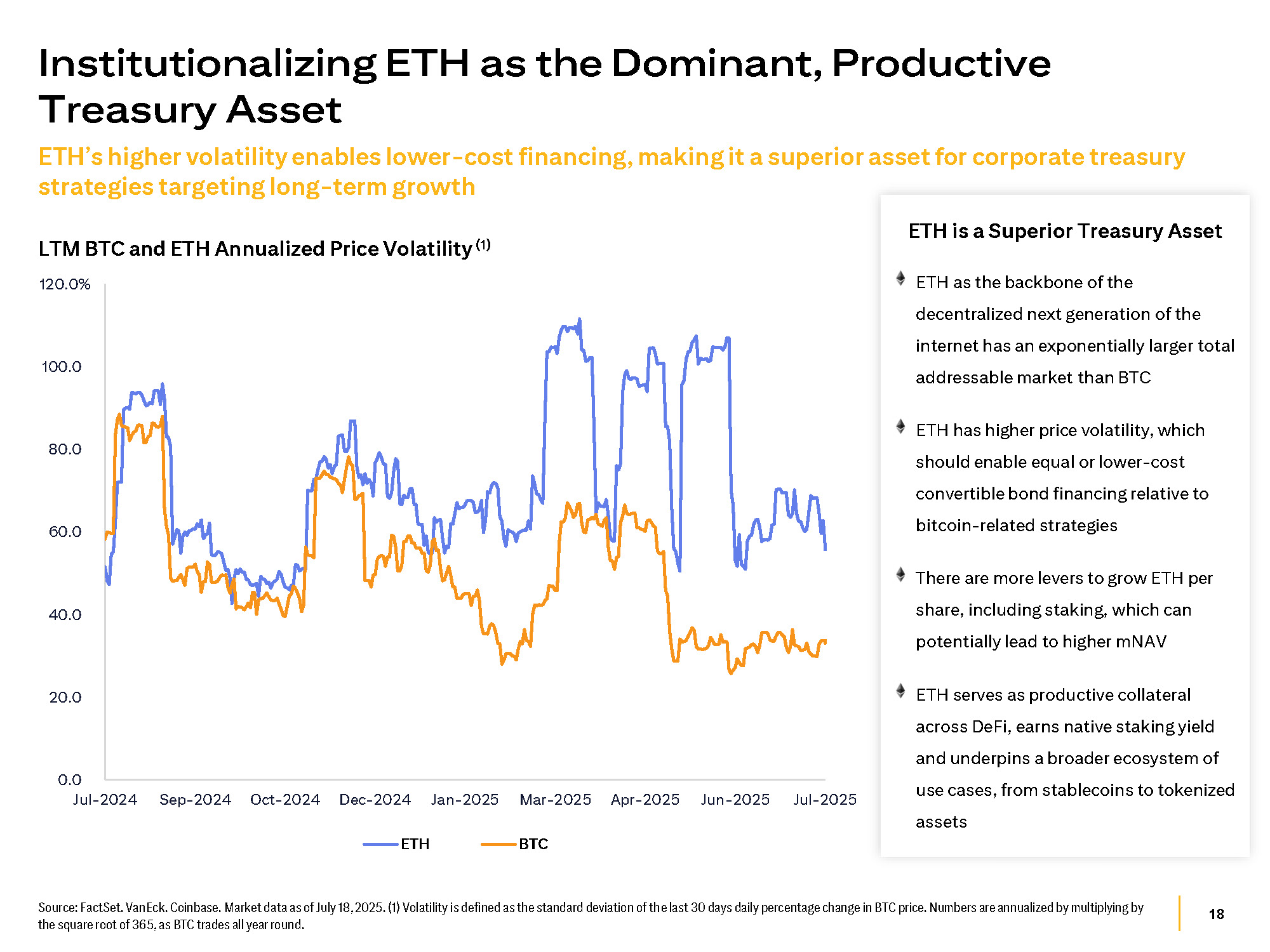 18 Source: FactSet. VanEck. Coinbase. Market data as of July 18, 2025. (1) Volatility is defined as the standard deviation of the last 30 days daily percentage change in BTC price. Numbers are annualized by multiplying by the square root of 365, as BTC trades all year round. ETH’s higher volatility enables lower - cost financing, making it a superior asset for corporate treasury strategies targeting long - term growth Institutionalizing ETH as the Dominant, Productive Treasury Asset 0.0 20.0 40.0 60.0 80.0 100.0 120.0% Jul - 2024 Sep - 2024 Oct - 2024 Dec - 2024 Jan - 2025 Mar - 2025 Apr - 2025 Jun - 2025 Jul - 2025 ETH BTC ETH is a Superior Treasury Asset ETH as the backbone of the decentralized next generation of the internet has an exponentially larger total addressable market than BTC ETH has higher price volatility, which should enable equal or lower - cost convertible bond financing relative to bitcoin - related strategies There are more levers to grow ETH per share, including staking, which can potentially lead to higher mNAV ETH serves as productive collateral across DeFi, earns native staking yield and underpins a broader ecosystem of use cases, from stablecoins to tokenized assets LTM BTC and ETH Annualized Price Volatility (1)
