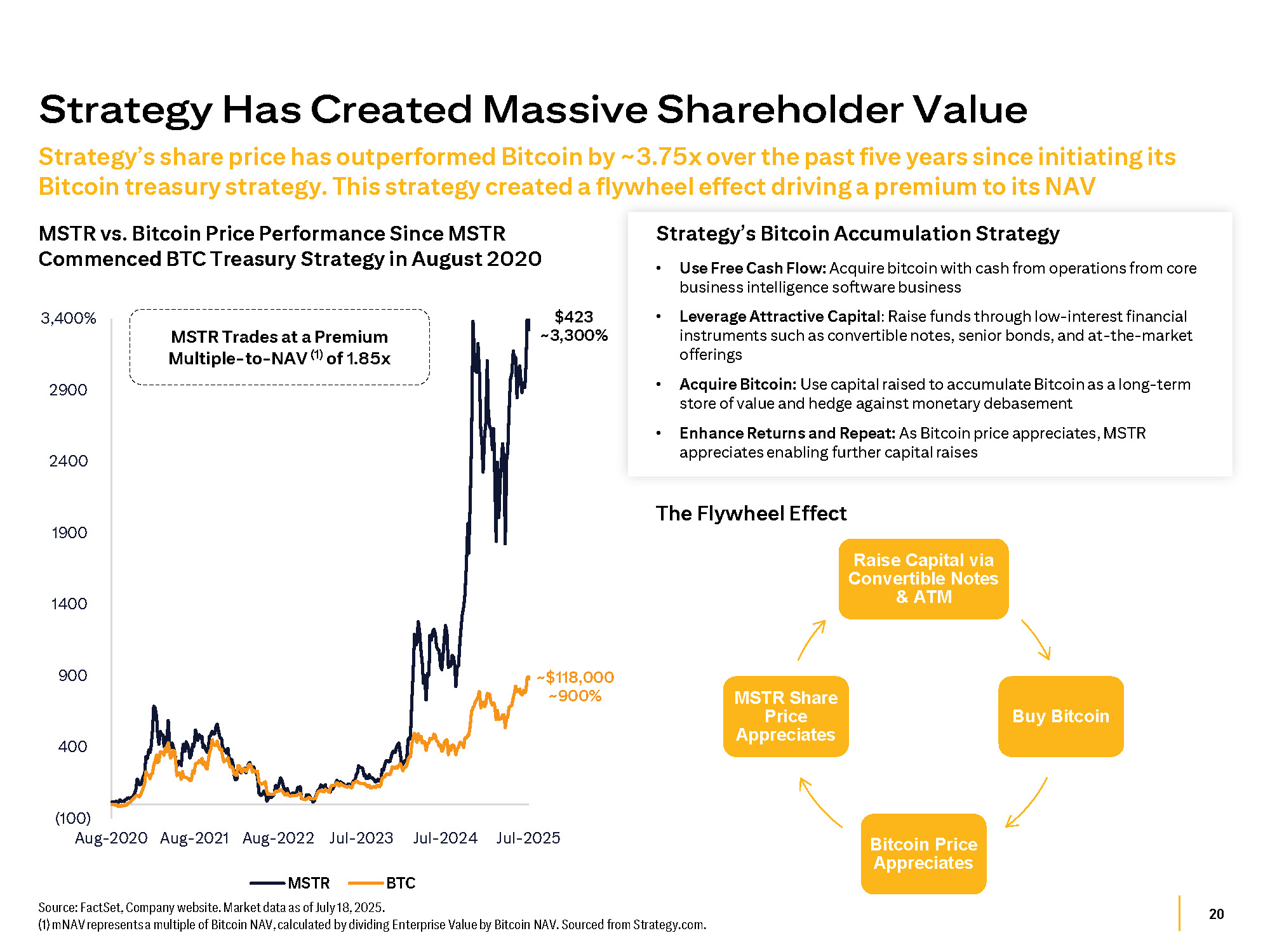 20 Strategy’s share price has outperformed Bitcoin by ~3.75x over the past five years since initiating its Bitcoin treasury strategy. This strategy created a flywheel effect driving a premium to its NAV Strategy Has Created Massive Shareholder Value Raise Capital via Convertible Notes & ATM Buy Bitcoin Bitcoin Price Appreciates MSTR Share Price Appreciates Strategy’s Bitcoin Accumulation Strategy • Use Free Cash Flow: Acquire bitcoin with cash from operations from core business intelligence software business • Leverage Attractive Capital : Raise funds through low - interest financial instruments such as convertible notes, senior bonds, and at - the - market offerings • Acquire Bitcoin: Use capital raised to accumulate Bitcoin as a long - term store of value and hedge against monetary debasement • Enhance Returns and Repeat: As Bitcoin price appreciates, MSTR appreciates enabling further capital raises $423 ~3,300% ~$118,000 ~900% (100) Aug - 2020 Aug - 2021 Aug - 2022 Jul - 2023 Jul - 2024 Jul - 2025 400 900 1400 1900 2400 2900 3,400% MSTR BTC Source: FactSet, Company website. Market data as of July 18, 2025. (1) mNAV represents a multiple of Bitcoin NAV, calculated by dividing Enterprise Value by Bitcoin NAV. Sourced from Strategy.com. MSTR vs. Bitcoin Price Performance Since MSTR Commenced BTC Treasury Strategy in August 2020 MSTR Trades at a Premium Multiple - to - NAV (1) of 1.85x The Flywheel Effect