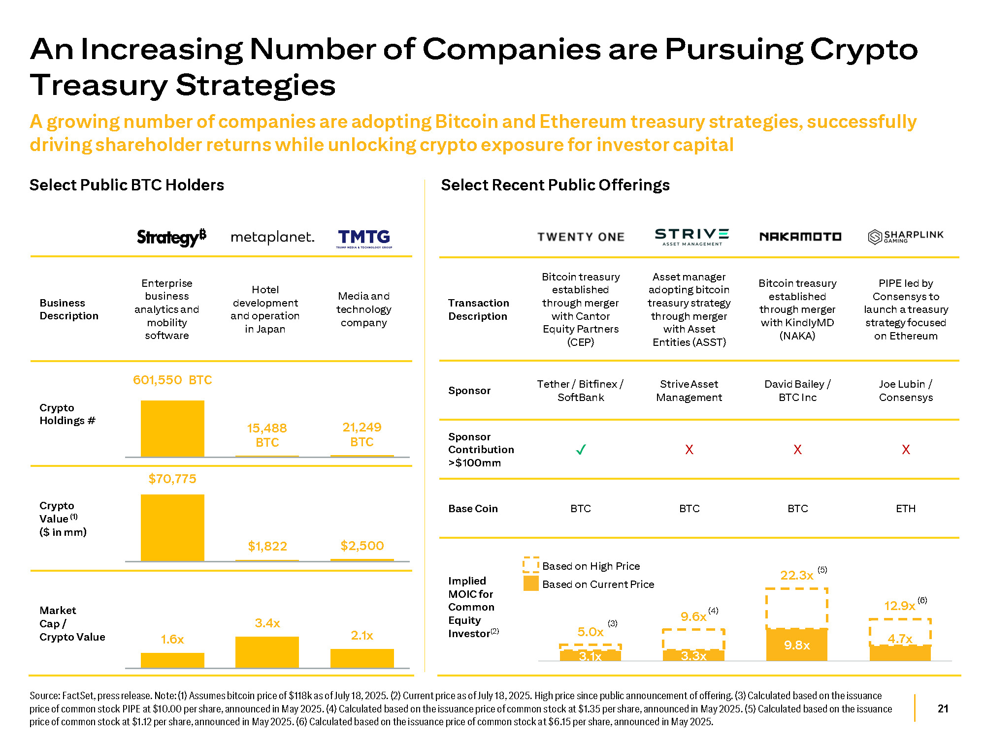 21 Media and technology company Hotel development and operation in Japan Enterprise business analytics and mobility software Business Description 601,550 BTC Crypto 21,249 15,488 Holdings # BTC BTC $70,775 Crypto Value (1) ($ in mm) $2,500 $1,822 2.1x 3.4x 1.6x Market Cap / Crypto Value PIPE led by Consensys to launch a treasury strategy focused on Ethereum Bitcoin treasury established through merger with KindlyMD (NAKA) Asset manager adopting bitcoin treasury strategy through merger with Asset Entities (ASST) Bitcoin treasury established through merger with Cantor Equity Partners (CEP) Transaction Description Joe Lubin / Consensys David Bailey / BTC Inc Strive Asset Management Tether / Bitfinex / SoftBank Sponsor X X X Sponsor Contribution >$100mm ETH BTC BTC BTC Base Coin Based on High Price (5) Implied Based on Current Price 22.3x MOIC for Common 12.9x (6) Equity 9.6x (4) (3) Investor (2) 5.0x 4.7x 9.8x 3.1x 3.3x Source: FactSet, press release. Note: (1) Assumes bitcoin price of $118k as of July 18, 2025. (2) Current price as of July 18, 2025. High price since public announcement of offering. (3) Calculated based on the issuance price of common stock PIPE at $10.00 per share, announced in May 2025. (4) Calculated based on the issuance price of common stock at $1.35 per share, announced in May 2025. (5) Calculated based on the issuance price of common stock at $1.12 per share, announced in May 2025. (6) Calculated based on the issuance price of common stock at $6.15 per share, announced in May 2025. An Increasing Number of Companies are Pursuing Crypto Treasury Strategies A growing number of companies are adopting Bitcoin and Ethereum treasury strategies, successfully driving shareholder returns while unlocking crypto exposure for investor capital Select Public BTC Holders Select Recent Public Offerings