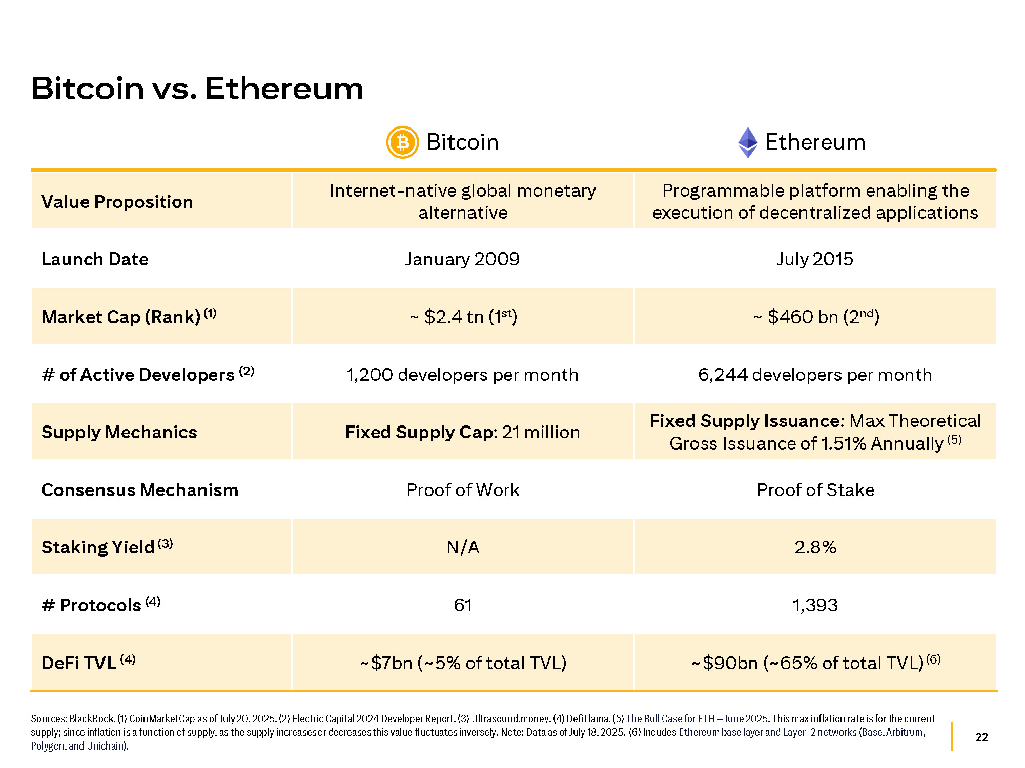 22 Sources: BlackRock. (1) CoinMarketCap as of July 20, 2025. (2) Electric Capital 2024 Developer Report. (3) Ultrasound.money. (4) DefiLlama. (5) The Bull Case for ETH – June 2025 . This max inflation rate is for the current supply; since inflation is a function of supply, as the supply increases or decreases this value fluctuates inversely. Note: Data as of July 18, 2025. (6) Incudes Ethereum base layer and Layer - 2 networks (Base, Arbitrum, Polygon, and Unichain). Bitcoin vs. Ethereum Ethereum Bitcoin Programmable platform enabling the execution of decentralized applications Internet - native global monetary alternative Value Proposition July 2015 January 2009 Launch Date ~ $460 bn (2 nd ) ~ $2.4 tn (1 st ) Market Cap (Rank) (1) 6,244 developers per month 1,200 developers per month # of Active Developers (2) Fixed Supply Issuance : Max Theoretical Gross Issuance of 1.51% Annually (5) Fixed Supply Cap : 21 million Supply Mechanics Proof of Stake Proof of Work Consensus Mechanism 2.8% N/A Staking Yield (3) 1,393 61 # Protocols (4) ~$90bn (~65% of total TVL) (6) ~$7bn (~5% of total TVL) DeFi TVL (4)