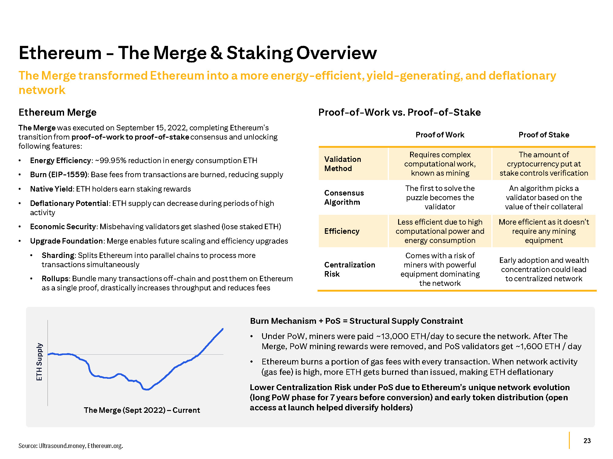 23 Source: Ultrasound.money, Ethereum.org. The Merge transformed Ethereum into a more energy - efficient, yield - generating, and deflationary network Ethereum - The Merge & Staking Overview Proof of Stake Proof of Work The amount of cryptocurrency put at stake controls verification Requires complex computational work, known as mining Validation Method An algorithm picks a validator based on the value of their collateral The first to solve the puzzle becomes the validator Consensus Algorithm More efficient as it doesn’t require any mining equipment Less efficient due to high computational power and energy consumption Efficiency Early adoption and wealth concentration could lead to centralized network Comes with a risk of miners with powerful equipment dominating the network Centralization Risk Ethereum Merge The Merge was executed on September 15, 2022, completing Ethereum's transition from proof - of - work to proof - of - stake consensus and unlocking following features: • Energy Efficiency : ~99.95% reduction in energy consumption ETH • Burn (EIP - 1559) : Base fees from transactions are burned, reducing supply • Native Yield : ETH holders earn staking rewards • Deflationary Potential : ETH supply can decrease during periods of high activity • Economic Security : Misbehaving validators get slashed (lose staked ETH) • Upgrade Foundation : Merge enables future scaling and efficiency upgrades • Sharding : Splits Ethereum into parallel chains to process more transactions simultaneously • Rollups : Bundle many transactions off - chain and post them on Ethereum as a single proof, drastically increases throughput and reduces fees Proof - of - Work vs. Proof - of - Stake Burn Mechanism + PoS = Structural Supply Constraint • Under PoW, miners were paid ~13,000 ETH/day to secure the network. After The Merge, PoW mining rewards were removed, and PoS validators get ~1,600 ETH / day • Ethereum burns a portion of gas fees with every transaction. When network activity (gas fee) is high, more ETH gets burned than issued, making ETH deflationary Lower Centralization Risk under PoS due to Ethereum’s unique network evolution (long PoW phase for 7 years before conversion) and early token distribution (open access at launch helped diversify holders) ETH Supply The Merge (Sept 2022) – Current